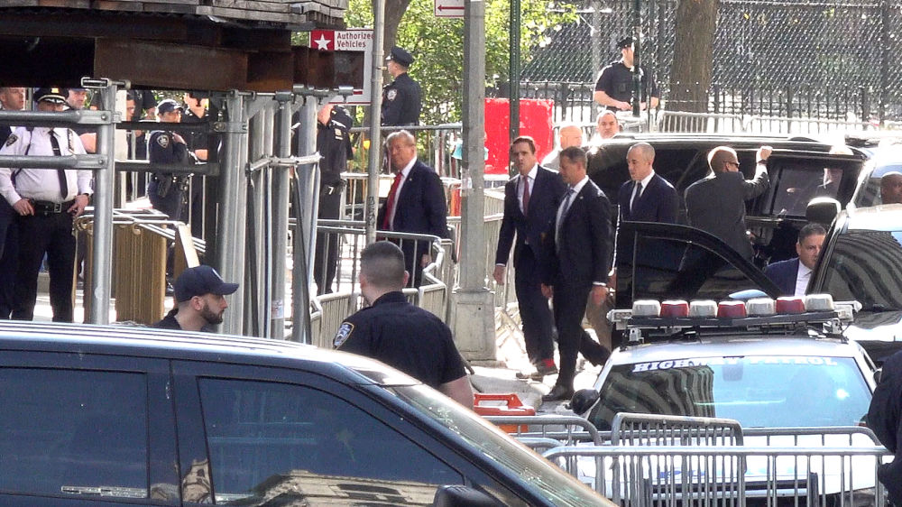 这张4月15日的视频截图显示,美国前总统特朗普抵达纽约曼哈顿一家刑事法院出庭。 新华社