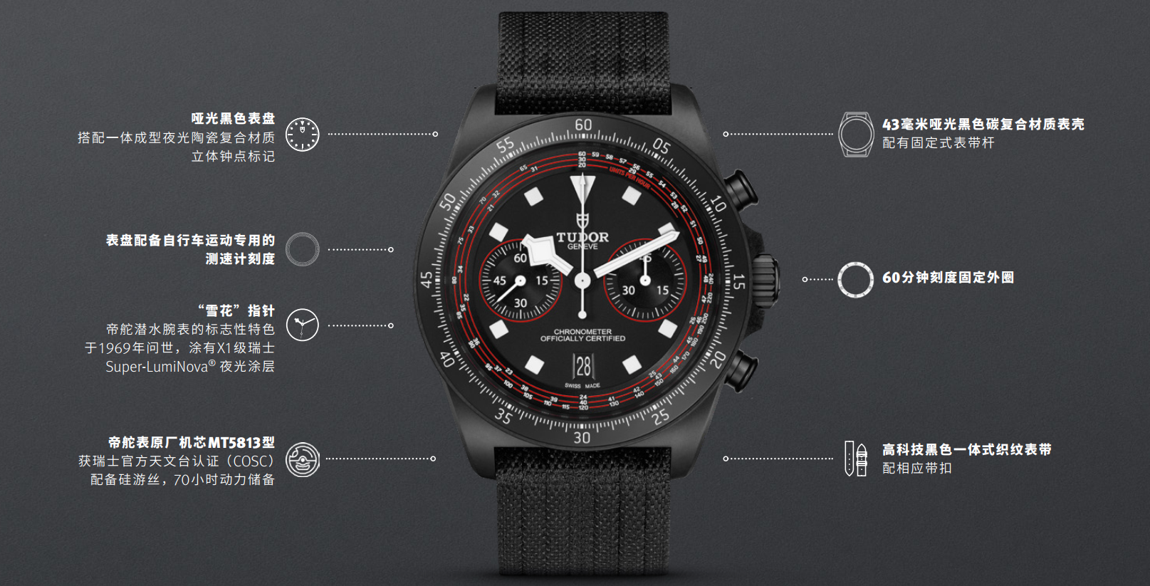 职业自行车是一项极富挑战的竞技性运动。踏板踩下的每一步都考验着车手体能与心志的极限,途中更是随时可能发生致命风险。因此,这款以职业自行车运动为灵感的腕表,不仅要满足该运动的严苛要求,还要方便车手操作。帝舵表从职业装备中汲取灵感,正如世上最快的自行车均由碳纤维制造,帝舵表亦特别选用碳复合材质打造这款敢为自行车手必备的新款计时腕表。钛金属元素则令其更为坚固,以便应对自行车运动中变幻莫测的突发状除了坚固耐用,帝舵表在设计时还充分考虑了车手在骑行过程中对腕表的实用需求。一般来说,计时腕表的测速计适用于测量汽车速度,帝舵表多款计时腕表所配备的基本也是与赛车运动相关的测速计。而这款“专业骑行版”的独特之处,就在于其测速计以自行车手的骑行速度为标准做出了调整。测速计刻度以螺旋方式“围绕”表盘,只需一瞥便可读取骑行时的平均速度。因此也可以说,领潜型FXD计时腕表“专业骑行版”的测速计功能专为自行车运动而设。