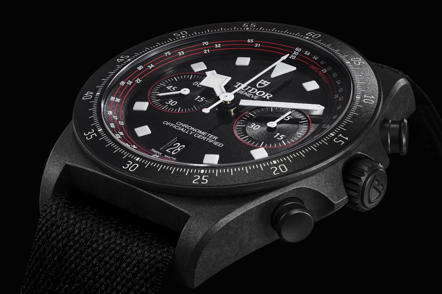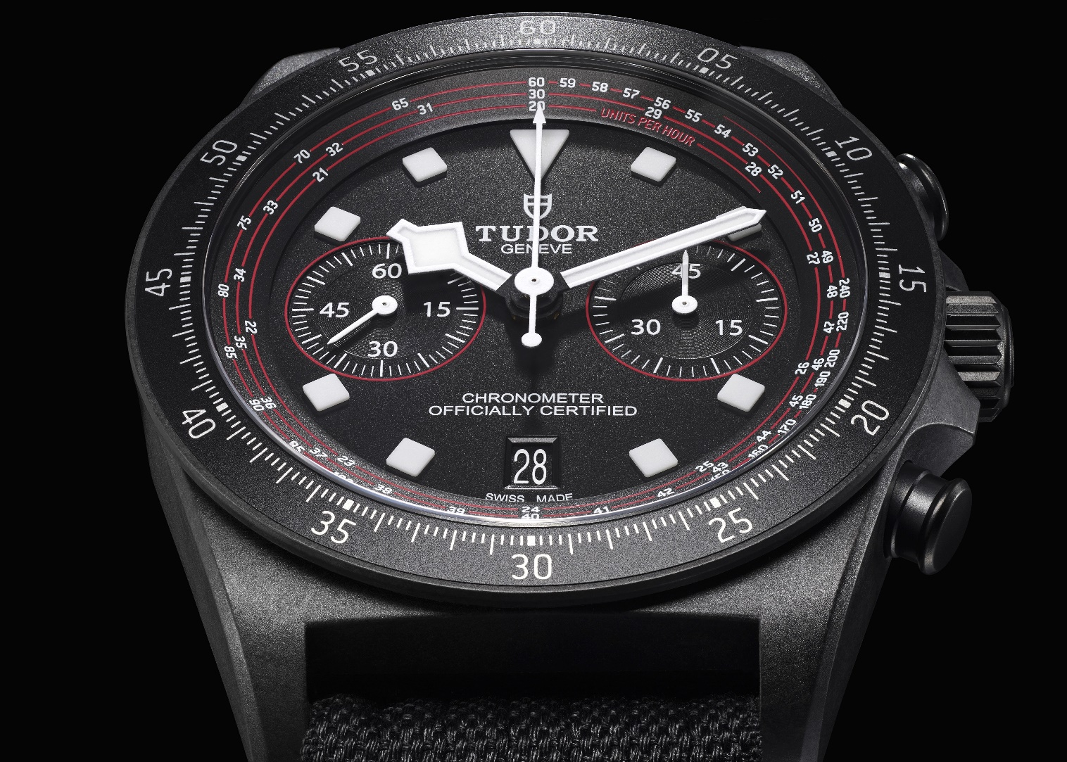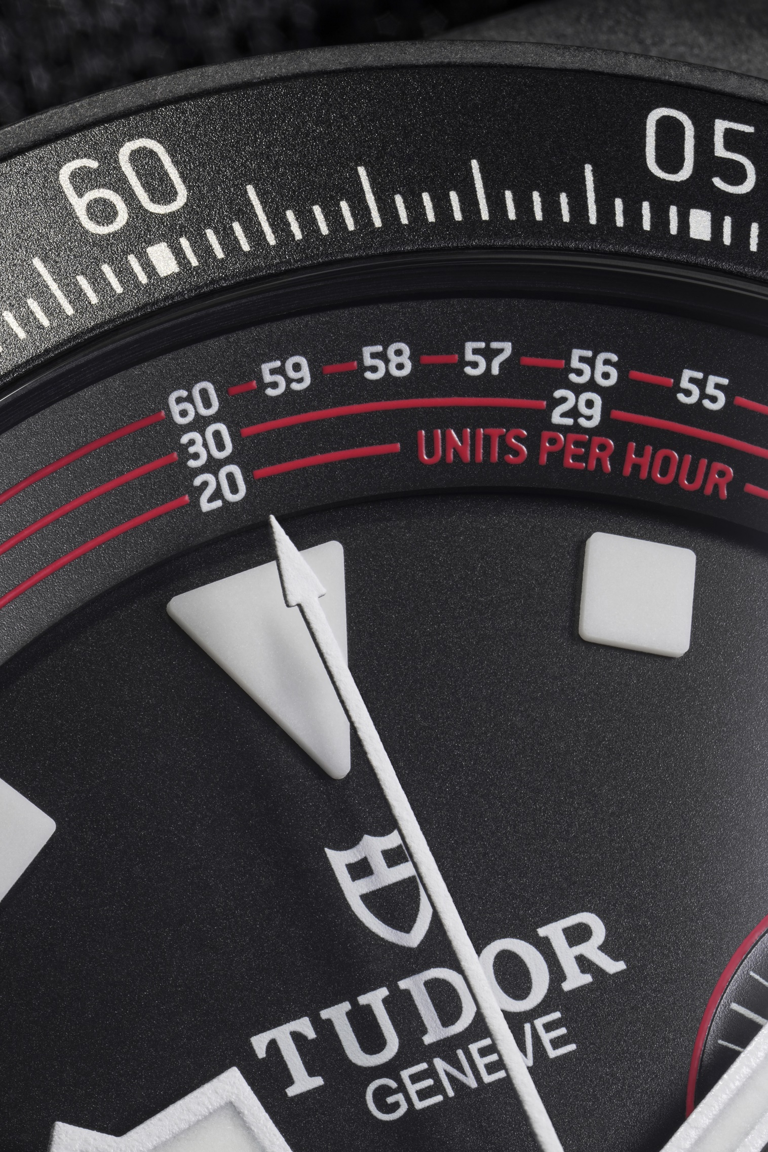 哑光黑色表盘上以醒目红色点缀,将读时清晰放在首位,经典配色更与帝舵表职业自行车队队色完美呼应。帝舵表独有的特色方形钟点标记与“雪花”指针早在六十年代由品牌精心设计,以夜光陶瓷复合材质制成,旨在增加发光面积,确保在严苛环境中清晰易读。表盘外缘印有经重新校准的测速计,刻度以45°倾斜,其内圈特别为专业自行车运动测速而设。
