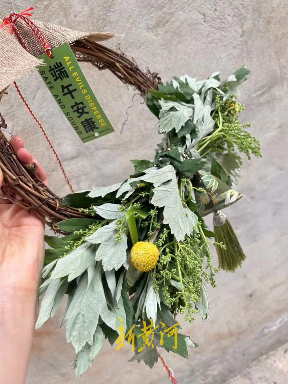 在线上,某淘宝店铺上线多款不同寓意的新式艾草门挂,售价31.9元至51.9元,近30日已售出逾1000件。通常配有艾草、菖蒲、女贞叶、小米果等叶材,以及香囊、寓意卡片等装饰。