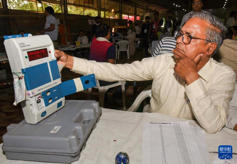 4日,在印度加济阿巴德,选举工作人员进行计票。