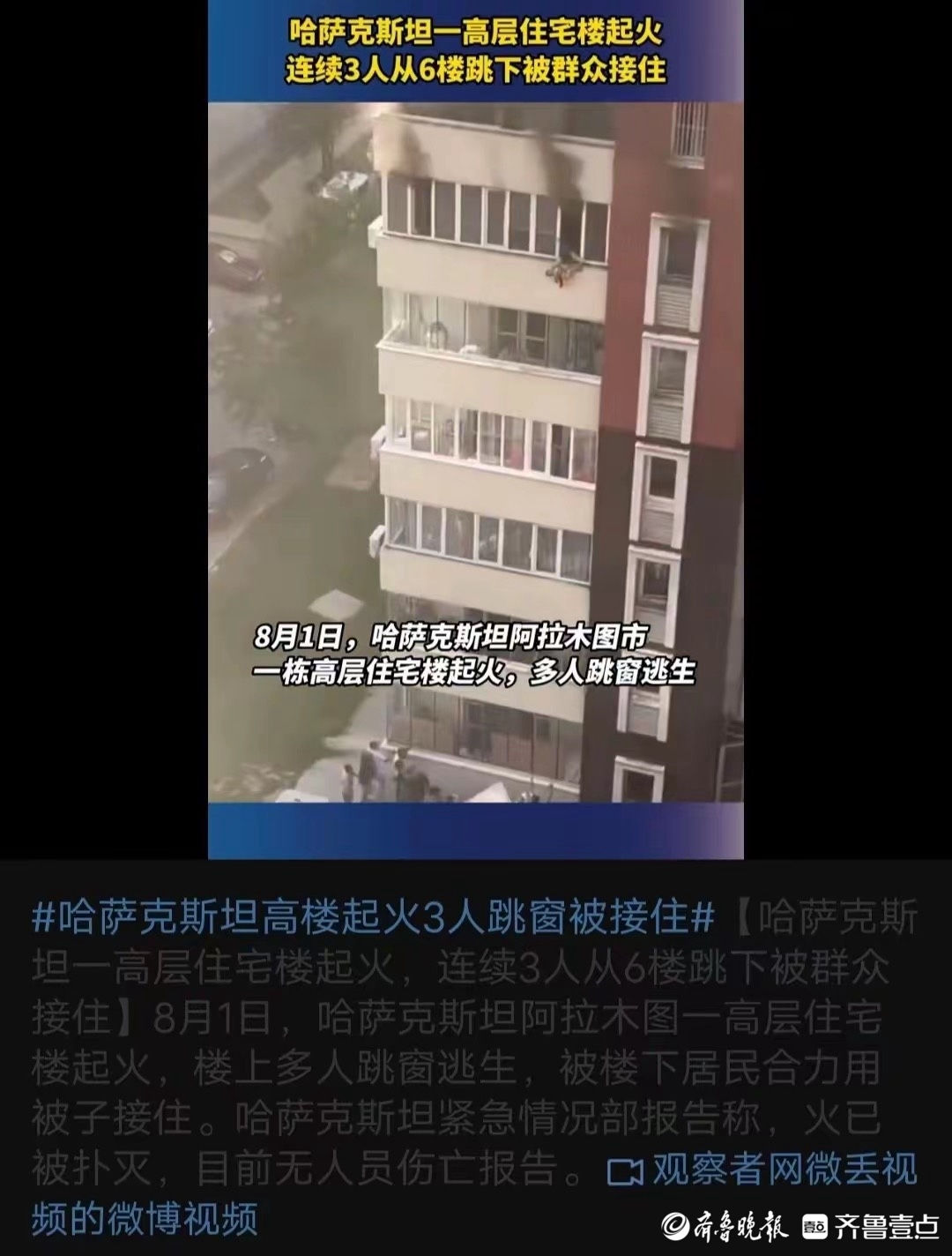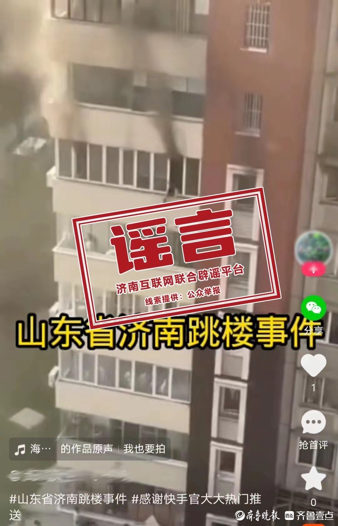 6月5日,有网民在短视频平台发消息称“山东省济南跳楼事件”,视频显示一高层住宅楼起火,连续3人从6楼跳下。