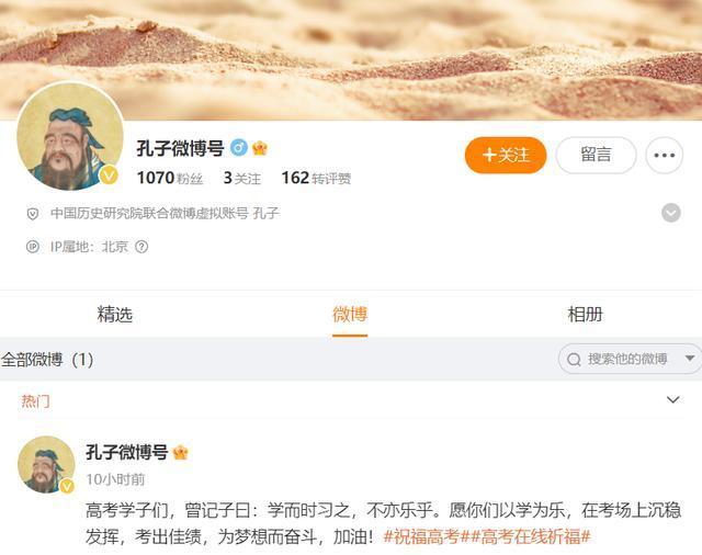 孔子微博号:高考学子们,曾记子曰:学而时习之,不亦乐乎。愿你们以学为乐,在考场上沉稳发挥,考出佳绩,为梦想而奋斗,加油!