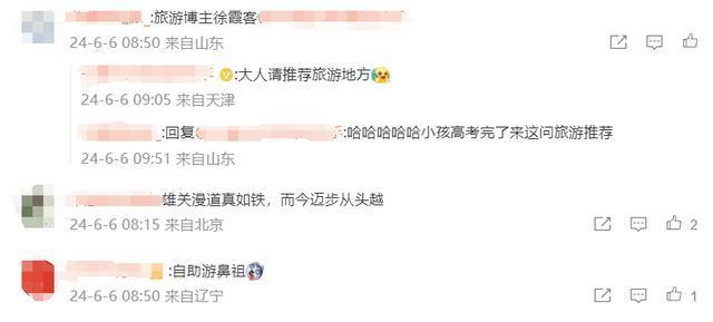 徐霞客微博号:高考生们,在下徐霞客是也。人生如漫漫旅程,高考仅是其中一站。愿你们在考场上坚定自信,勇敢前行,未来更有广阔天地待汝等探索。
