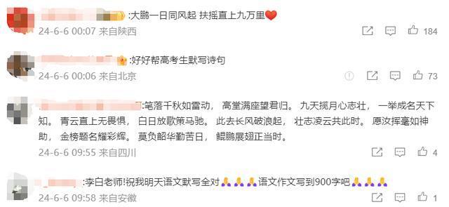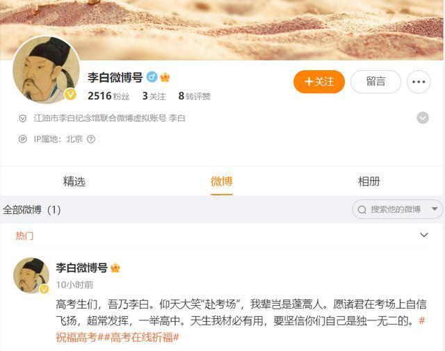 李白微博号:高考生们,吾乃李白。仰天大笑“赴考场”,我辈岂是蓬蒿人。愿诸君在考场上自信飞扬,超常发挥,一举高中。天生我材必有用,要坚信你们自己是独一无二的。