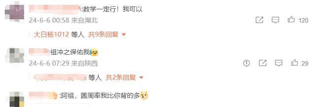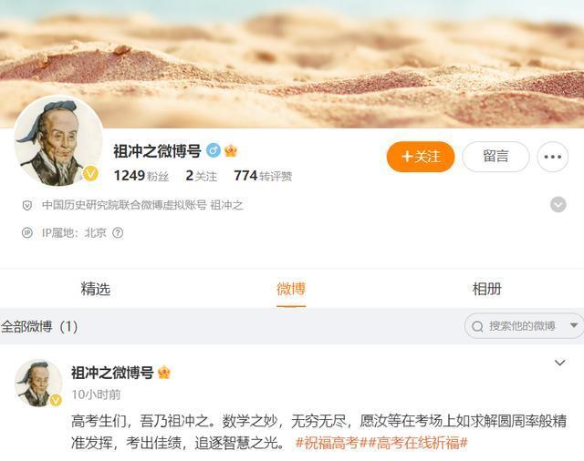 祖冲之微博号:高考生们,吾乃祖冲之。数学之妙,无穷无尽,愿汝等在考场上如求解圆周率般精准发挥,考出佳绩,追逐智慧之光。