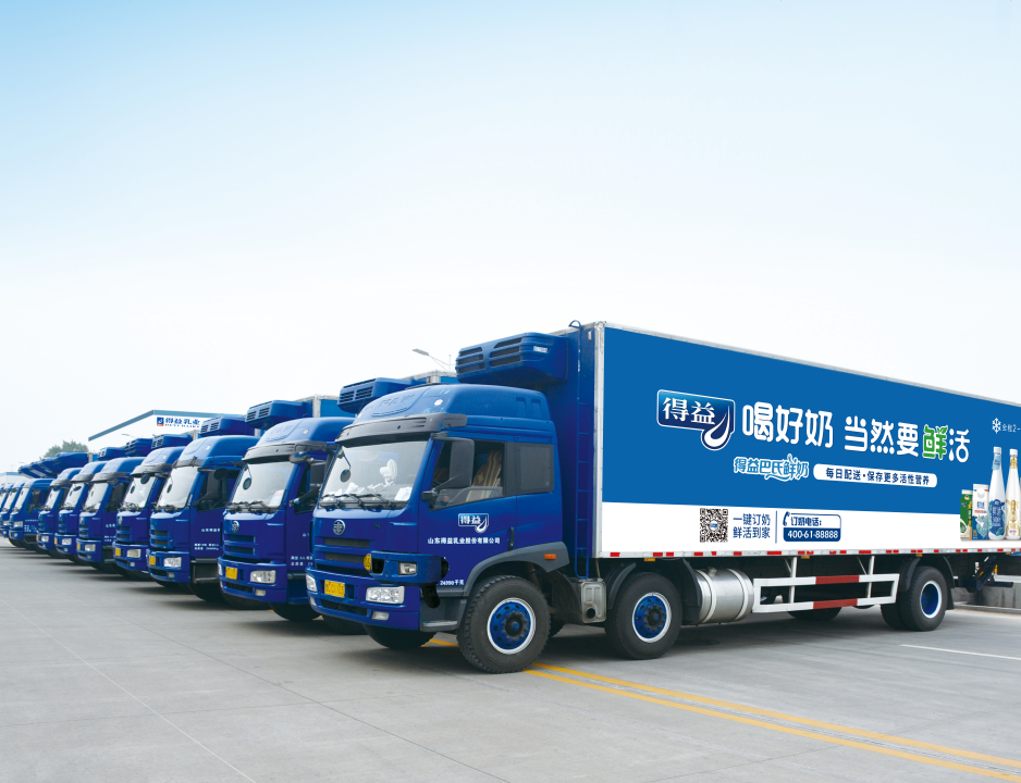 鲜活好奶当然要冷链配送,新鲜直达!2℃-6℃是鲜牛奶的黄金储藏温度。得益为实现冷链的全程控制,打造完善的“得益冷链物流控制体系”。配备500余辆冷藏车,引入先进的 WMS 仓库管理系统、TMS 运输管理系统、DPS 电子标签拣货系统、GPS全球定位系统及北斗卫星监控系统,对产品贮存、运输、交接等过程中的实时情况进行有效监控,确保2℃-6℃全程冷链储运,形成覆盖山东全省,辐射华北、华东的冷链物流网络,实现省内24小时、省外36小时送达,保证产品第一时间新鲜送达消费者手中。