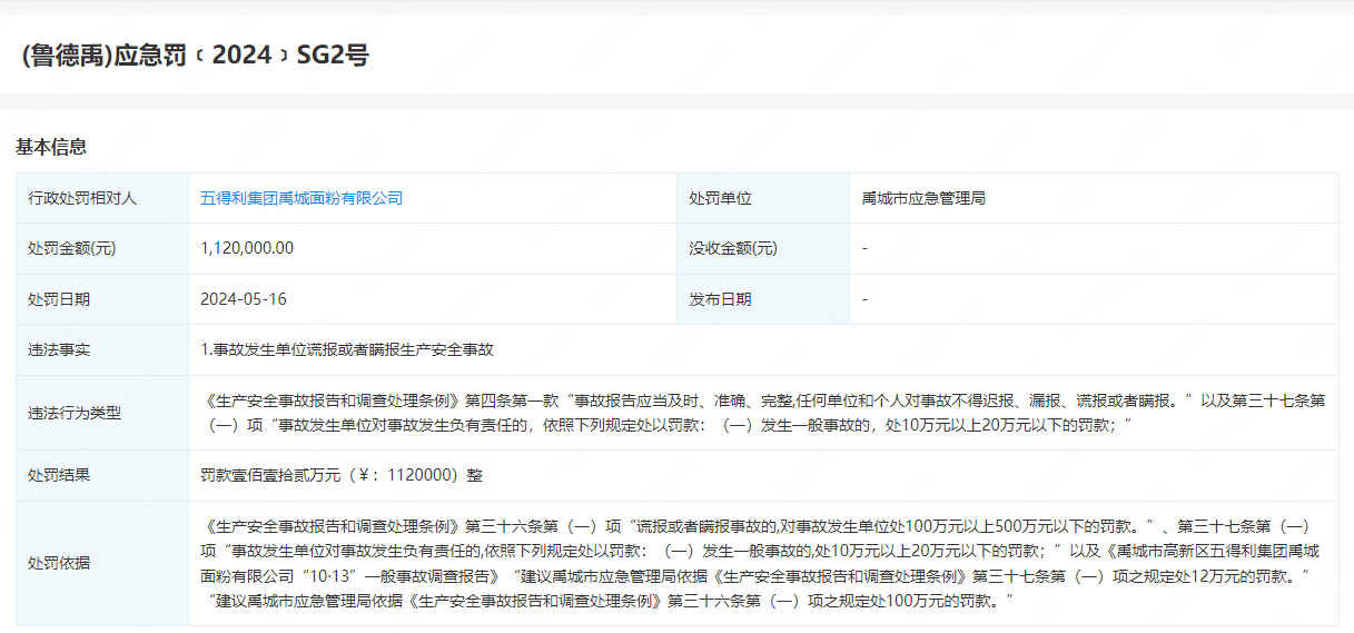 5月16日,禹城市应急管理局开具了处罚决定书——(鲁德禹)应急罚[2024)SG2号,对五得利集团禹城面粉有限公司谎报或者瞒报生产安全事故行为,罚款112万元。