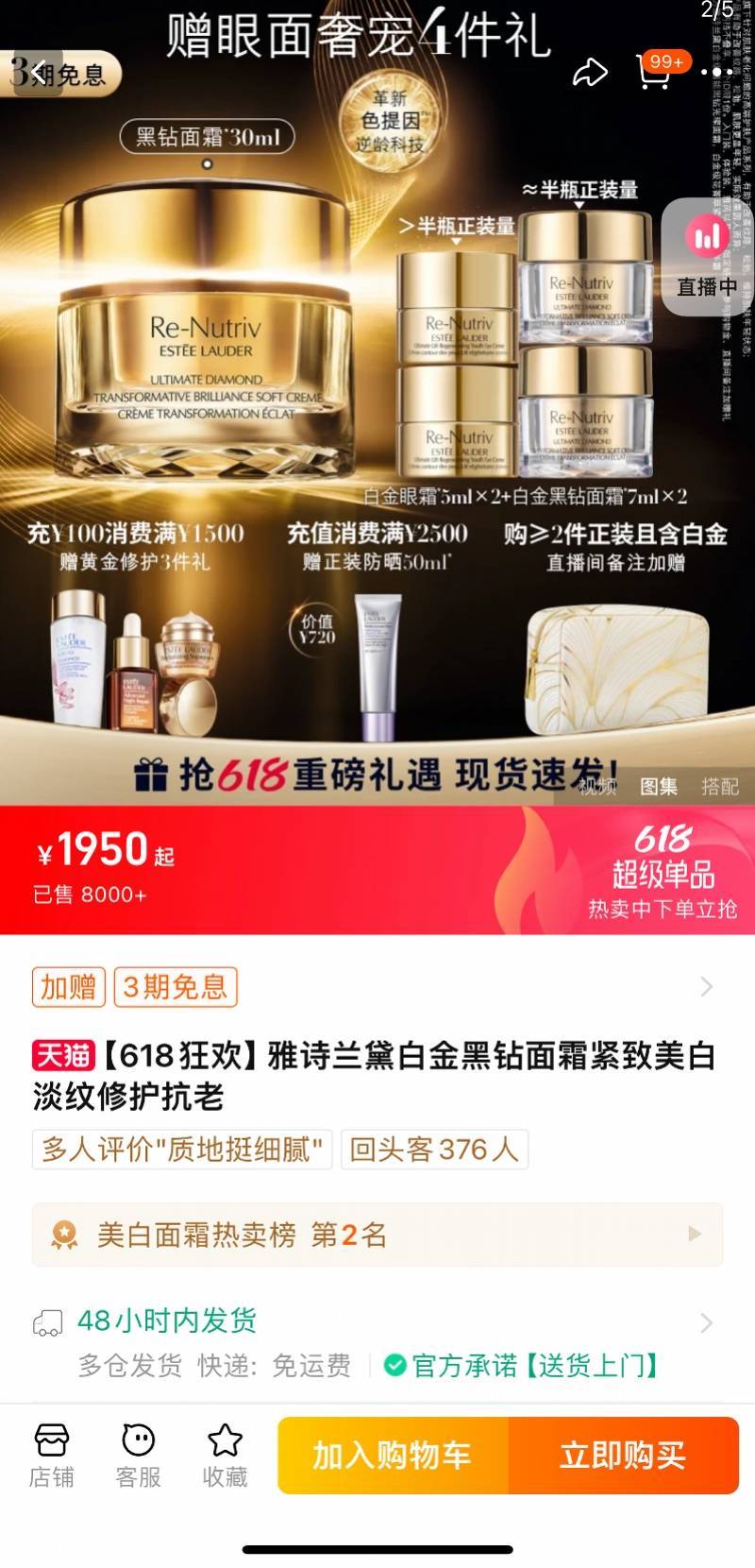 反而欧莱雅2023年全年业绩再创新高,净销售额已连续第三年实现两位数增长。雅诗兰黛在中国市场的市场占有率已被欧莱雅反超。据市场报告显示,中国高端化妆品市场排名前三的集团依次为欧莱雅、雅诗兰黛和LVMH,市场占有率分别为18.4%、14.4%和8.8%。中国市场销售下滑的危机感令雅诗兰黛集团加强了营销策略,包括年初与电视剧《繁花》联动,作为该剧官方赞助商,在剧中植入售价接近2000元的高端产品白金黑钻面霜。该面霜在618大促美白面霜热卖榜中排名第二位,截至目前已售出8000+份。
