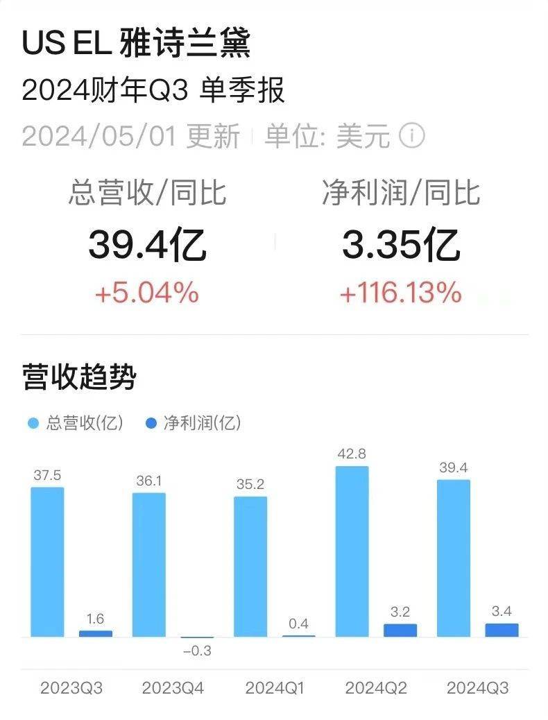 这一波营销市场反应良好,雅诗兰黛集团截至2024年3月31日止的2024财年第三季度的财务数据显示,利润与销售表现均好于预期。第三季度总营收同比增长5%,由37.5亿美元增长至39.4亿美元,净利润同比大涨116%至3.4亿美元。