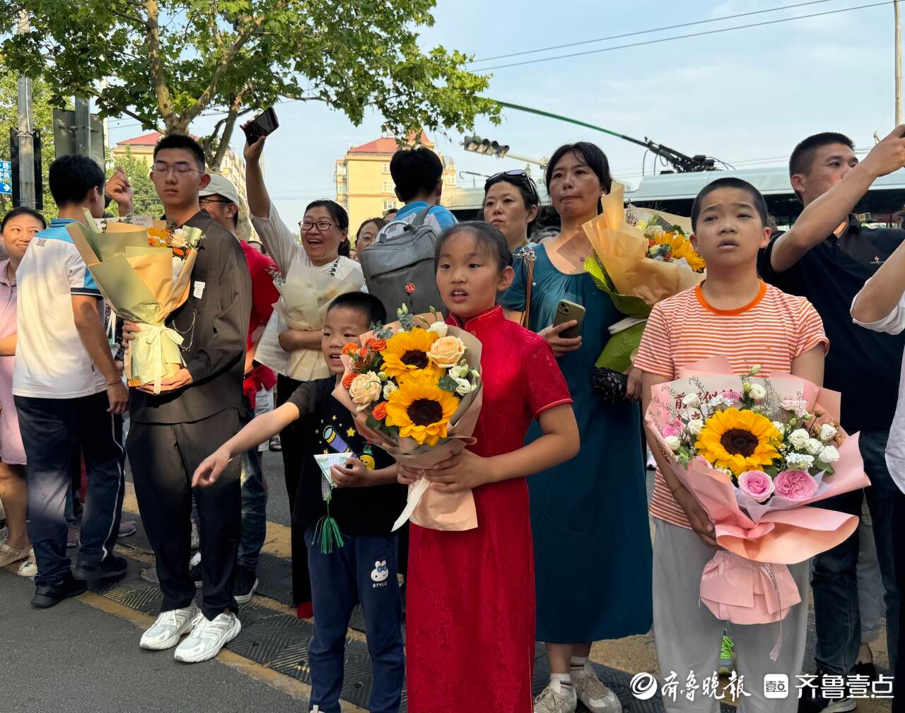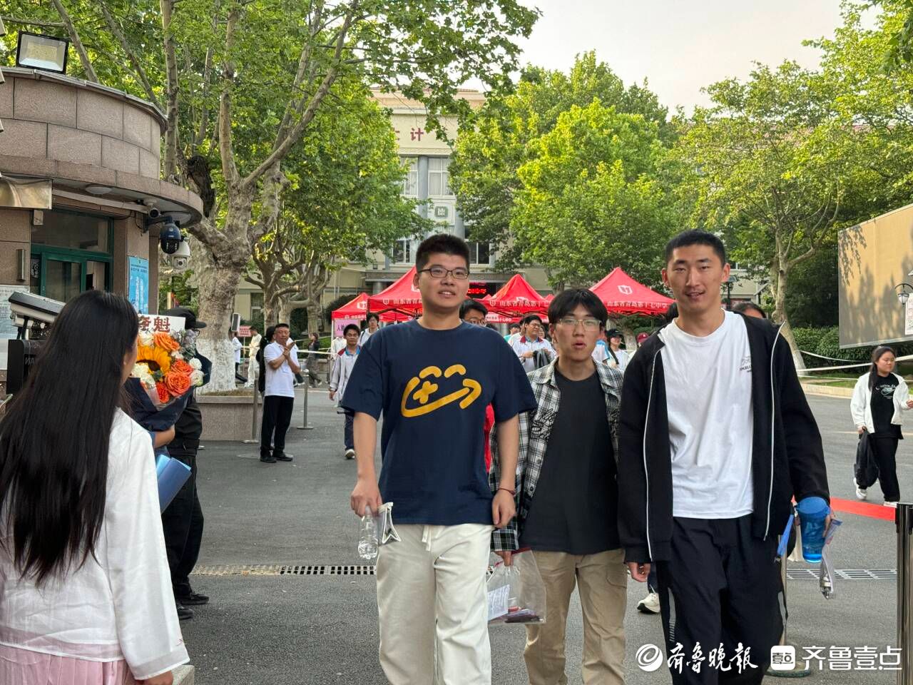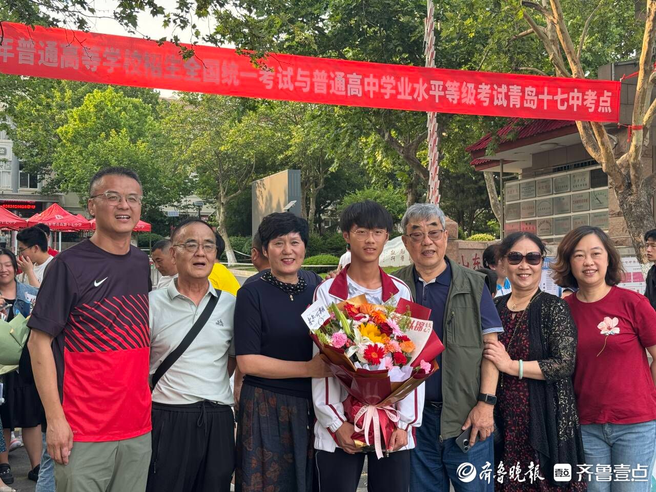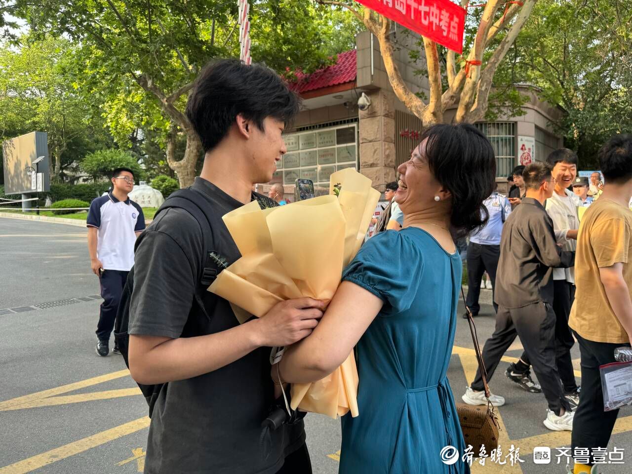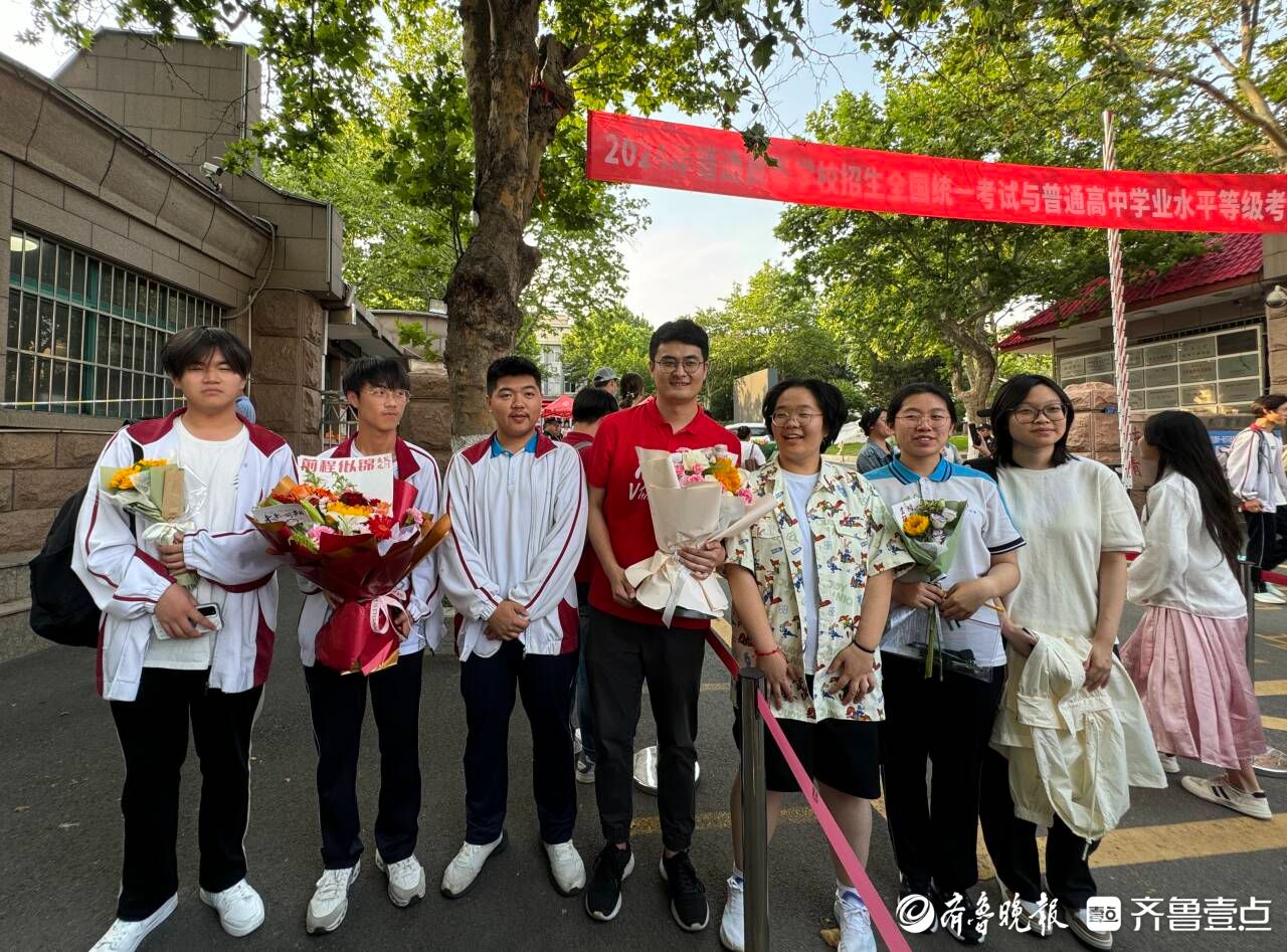 不少考生家长表示,上午考完后从孩子的表情上感觉物理、政治没有特别难,孩子应该发挥得还不错。“终于结束了!我们也不管他到底考得怎么样,顺利考完、坚持下来就是最棒的。”青岛十九中考生家长滕女士和孩子爸爸一起来迎接孩子,怀中还抱着一束葵花花束。“这是我们为他准备的小小仪式,孩子今晚想干啥我们就满足他。”滕女士笑着说道。同样结束了高考的青岛十七中考生宋同学,走出考场后收到了妈妈耿女士送的一束鲜花,母子俩还来了个大大的拥抱。