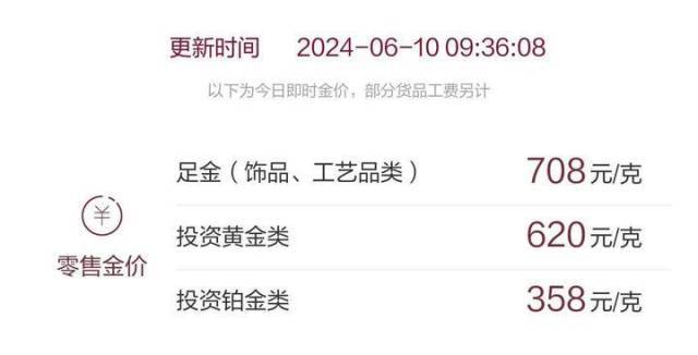 潮新闻查询发现,6月10日,周大福官网显示足金(饰品、工艺品类)价格为708元/克,周生生官网显示足金饰品价格为705元/克。而前期高点,国内足金首饰金价均突破740元/克。