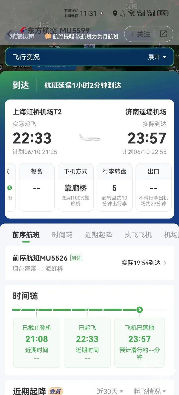 航旅纵横APP显示,6月10日,Mu5599航班从上海虹桥机场飞往济南遥墙机场,计划起飞时间是21时25分,计划到达时间是22时55分;实际起飞时间是22时33分,实际到达时间是23时57分。