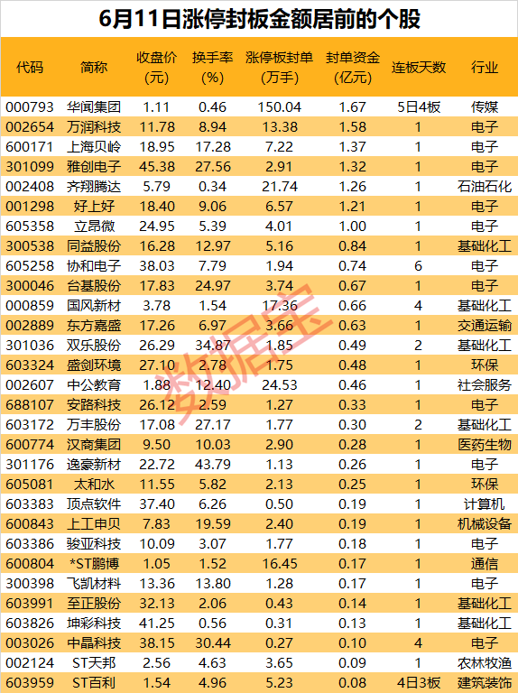 以封单金额计算,7股封单金额超1亿元,华闻集团、万润科技、上海贝岭封单金额分别为1.67亿元、1.58亿元、1.37亿元。