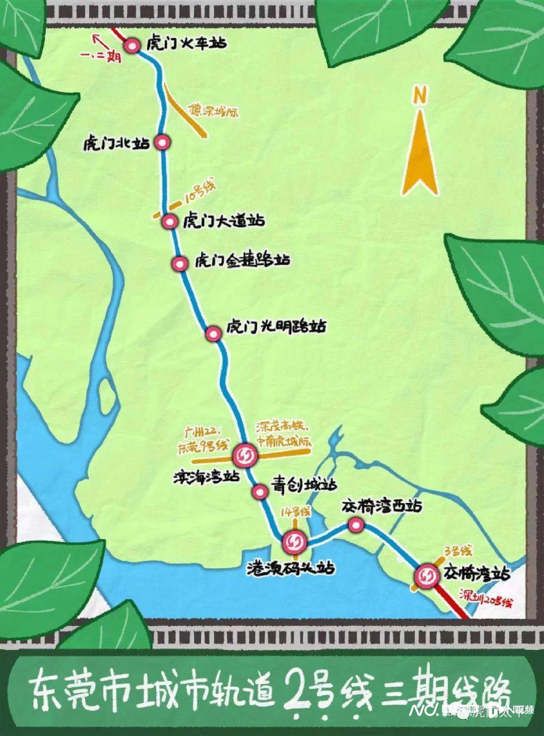 据了解,东莞地铁2号线三期工程系已经运营的2号线一、二期的延伸段,起于一、二期终点虎门火车站,止于交椅湾站,线路全长17.1公里。全线共设车站9座,其中虎门设站4座(虎门北站、虎门大道站、虎门金捷路站和虎门光明路站);滨海湾新区设站5座(滨海湾站、青创城站、港澳码头站、交椅湾西站、交椅湾站),轨道线路长约7.3公里。