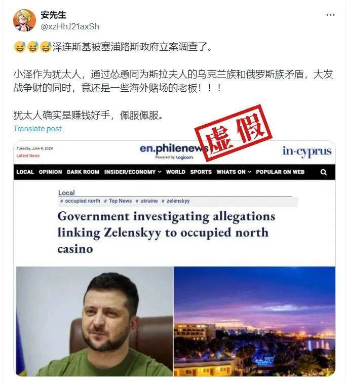 6月4日,乌克兰驻塞浦路斯共和国大使馆发布声明称,网传“泽连斯基购买位于塞浦路斯的赌场酒店”的说法是“假消息”。