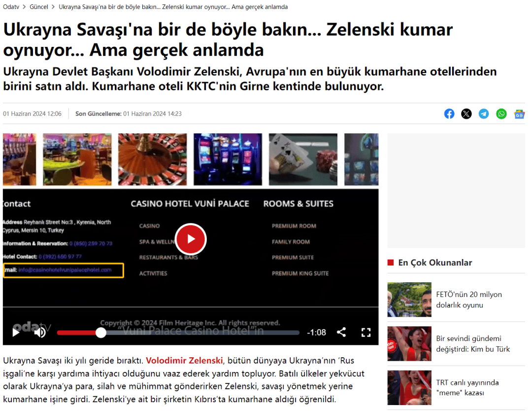 6月1日,Oda TV报道称,泽连斯基通过一家名为Film Heritage Inc.的公司,买下了塞浦路斯岛北部凯里尼亚境内的“沃尼宫赌场酒店”( Vuni Palace Casino Resort and Hotel),该酒店是欧洲最大的赌场酒店之一。报道中嵌入了一段视频,展示了一家疑似与“沃尼宫赌场酒店”相关的网站。从视频画面中,可以看到该网站的域名为casinohotelvunipalace.com。