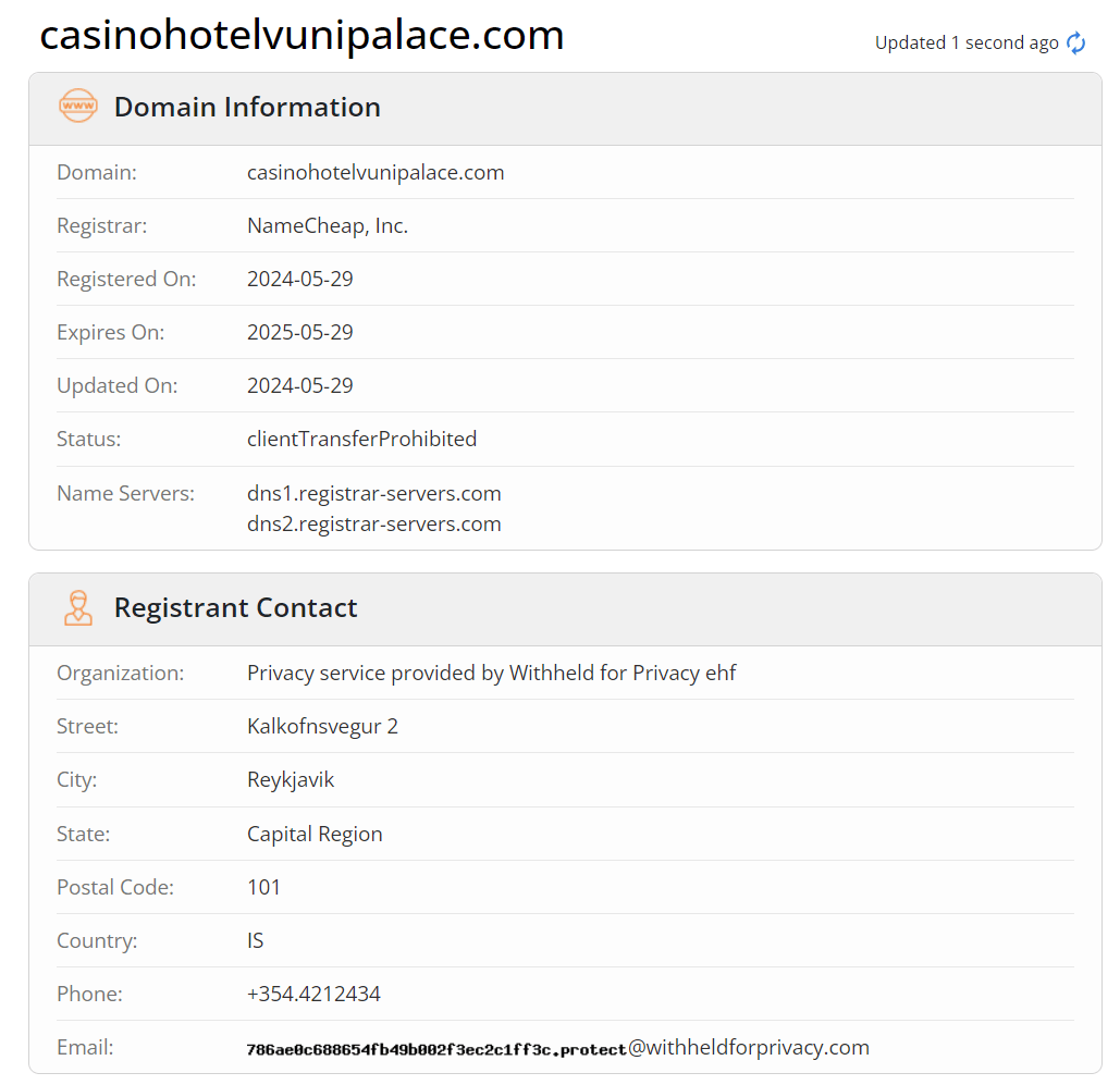 Whois信息显示,casinohotelvunipalace.com的注册时间在2024年5月29日,距Oda TV发文时注册时间不足一周。该网站的注册地显示在冰岛首都雷克雅未克,而非塞浦路斯。
