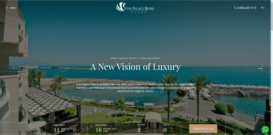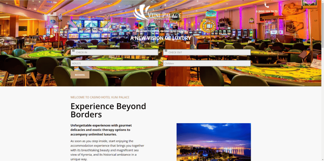 核查发现,“沃尼宫赌场酒店”确实存在,位于塞浦路斯岛北部。其官方网址为vunipalacehotel.com,网站使用的默认语言为土耳其语。