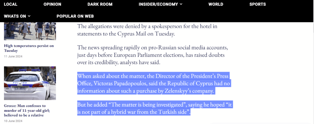 6月4日,philenews发布的报道内文截图。塞浦路斯总统新闻办公室主任维克托拉斯·帕帕佐普洛斯表示,塞浦路斯共和国没有关于泽连斯基购买赌场酒店的信息,并表示“此事正在调查之中”。