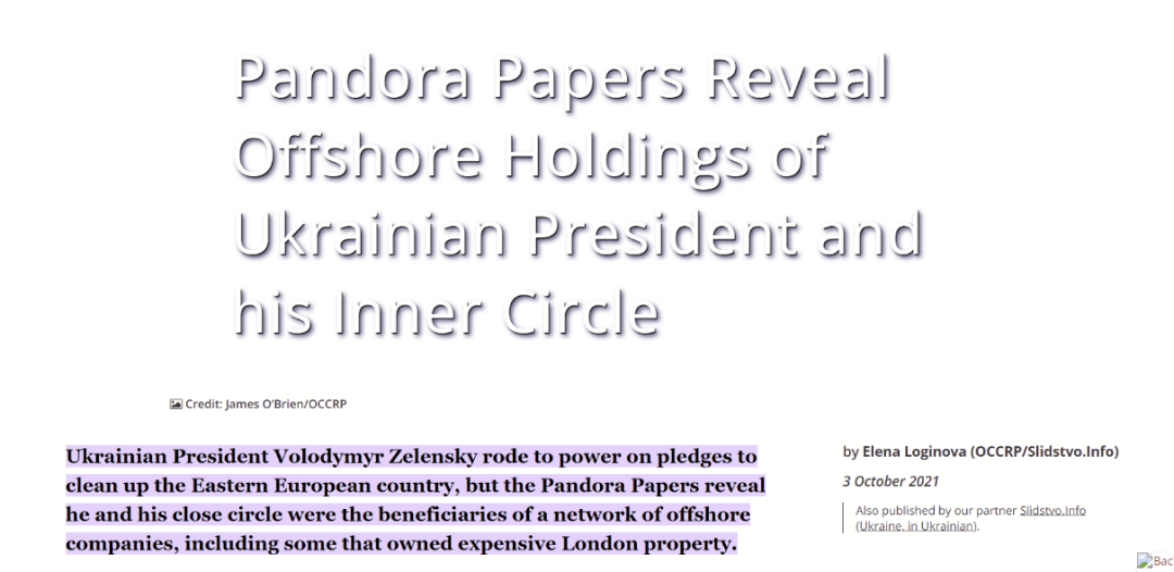 2021年10月3日,国际调查记者联盟发布报告,称其在数百万份文件中发现,泽连斯基及其合作伙伴在英属维尔京群岛、塞浦路斯和伯利兹等地建立了一个离岸公司网络。泽连斯基与其合伙人利用该网络购买并拥有了位于英国伦敦市中心的三处优质房产。