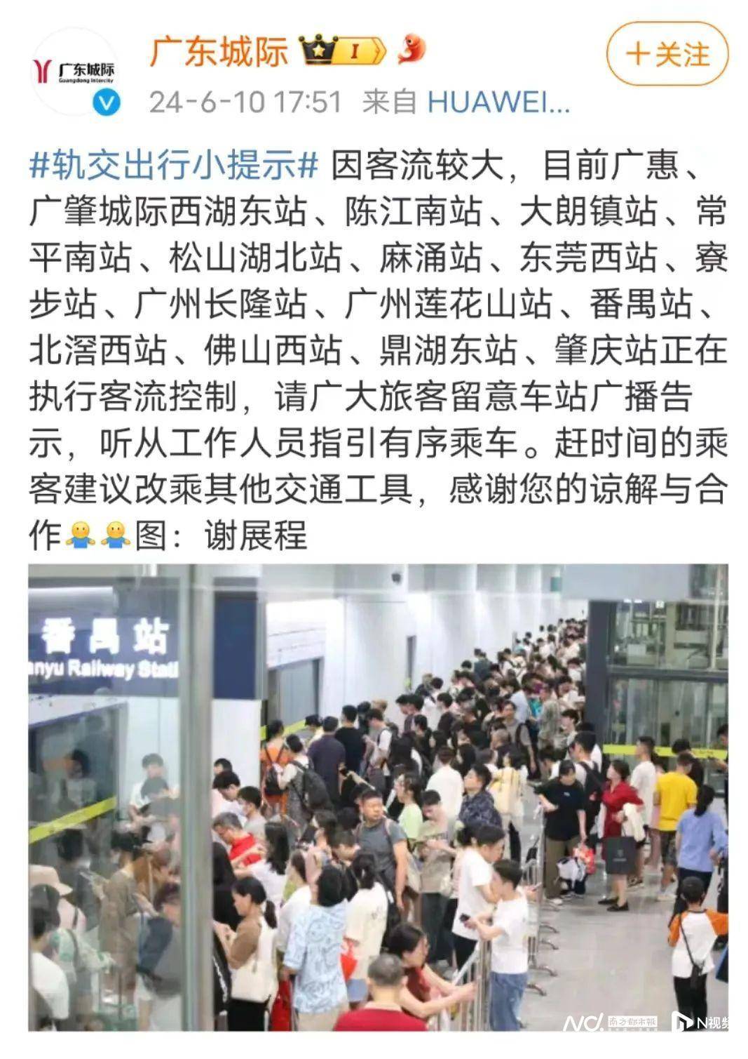 除了西平西站,很多站也迎来了客流量暴增。6月10日,广东城际发布执行客流控制的信息。图源:广东城际