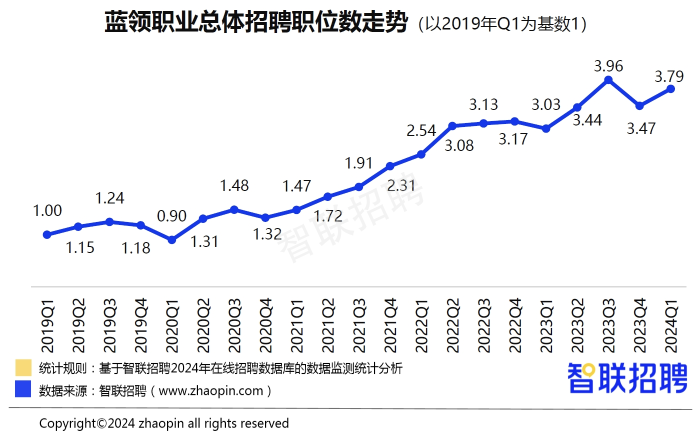 近年来,我国经济高质量发展稳步推进,制造业转型升级,服务型消费需求增长,带动蓝领人才招聘需求增加。智联招聘数据显示,2019年以来,蓝领岗位招聘需求持续上升。以2019年一季度为基数1,蓝领招聘职位数逐季波动上升,至今年一季度达到3.79,是2019年一季度的3.79倍。