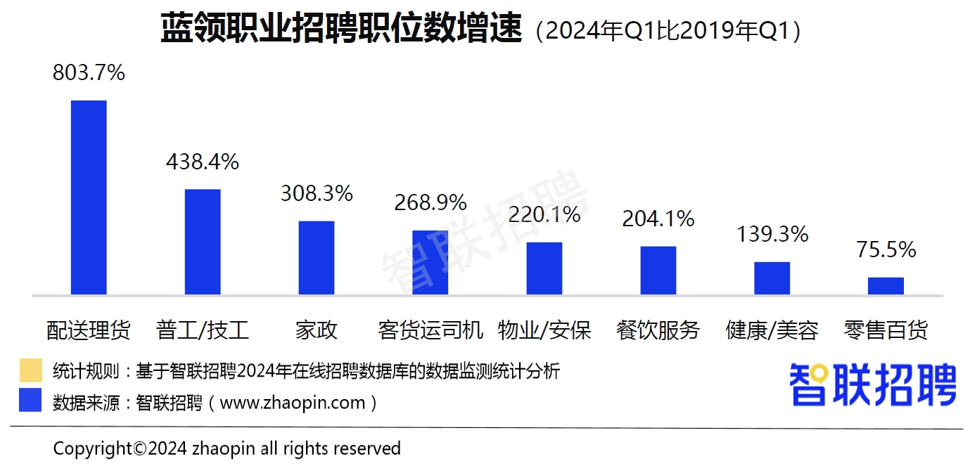 近日,智联招聘发布《2024蓝领人才发展报告》,从蓝领招聘需求、从业者结构、薪酬待遇,以及工作体验、诉求等方面全方位洞察行业现状。报告显示,国内蓝领人才需求持续攀升,今年一季度升至5年前同期3.8倍,配送理货人才需求比5年前上涨8倍,蓝领招聘薪酬比5年前上涨35.8%,涨幅高于全国总体水平……