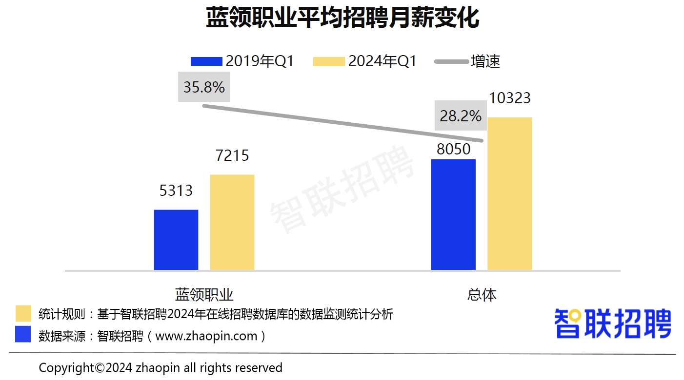 蓝领职业招聘需求增长的同时,招聘薪酬也攀上新台阶。2024年一季度,38个重点城市的蓝领职业平均招聘月薪为7215元,比2019年同期增长了35.8%,增幅比总体高出7.6个百分点。