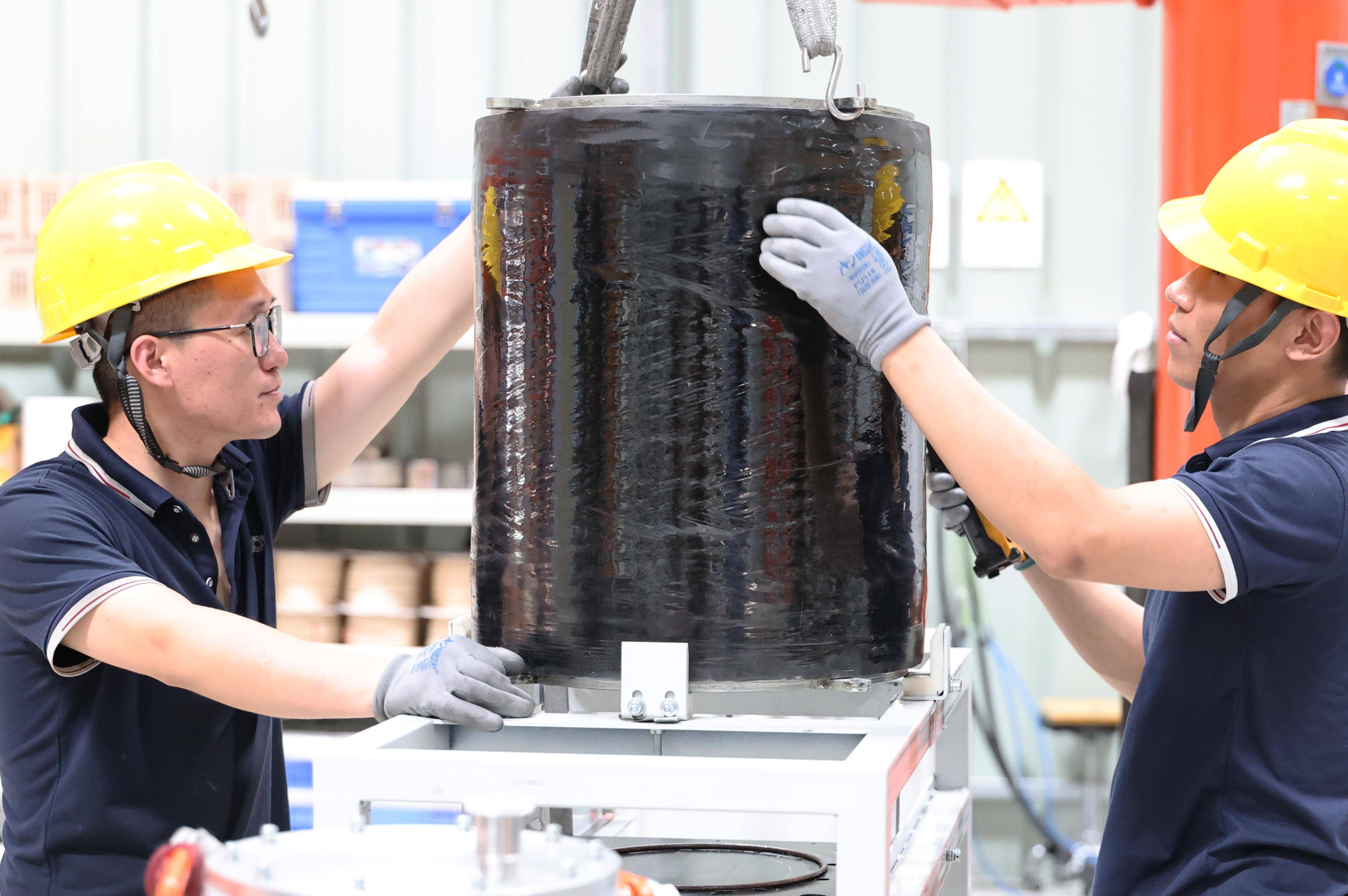 6月13日,沈阳微控飞轮技术股份有限公司工人在进行组装工作。沈阳微控飞轮技术股份有限公司成立于2018年,深耕飞轮储能领域,以磁悬浮飞轮技术成为一家“独角兽”企业,其产品最高转速可达41000转/分钟。 新华社记者 李钢 摄
