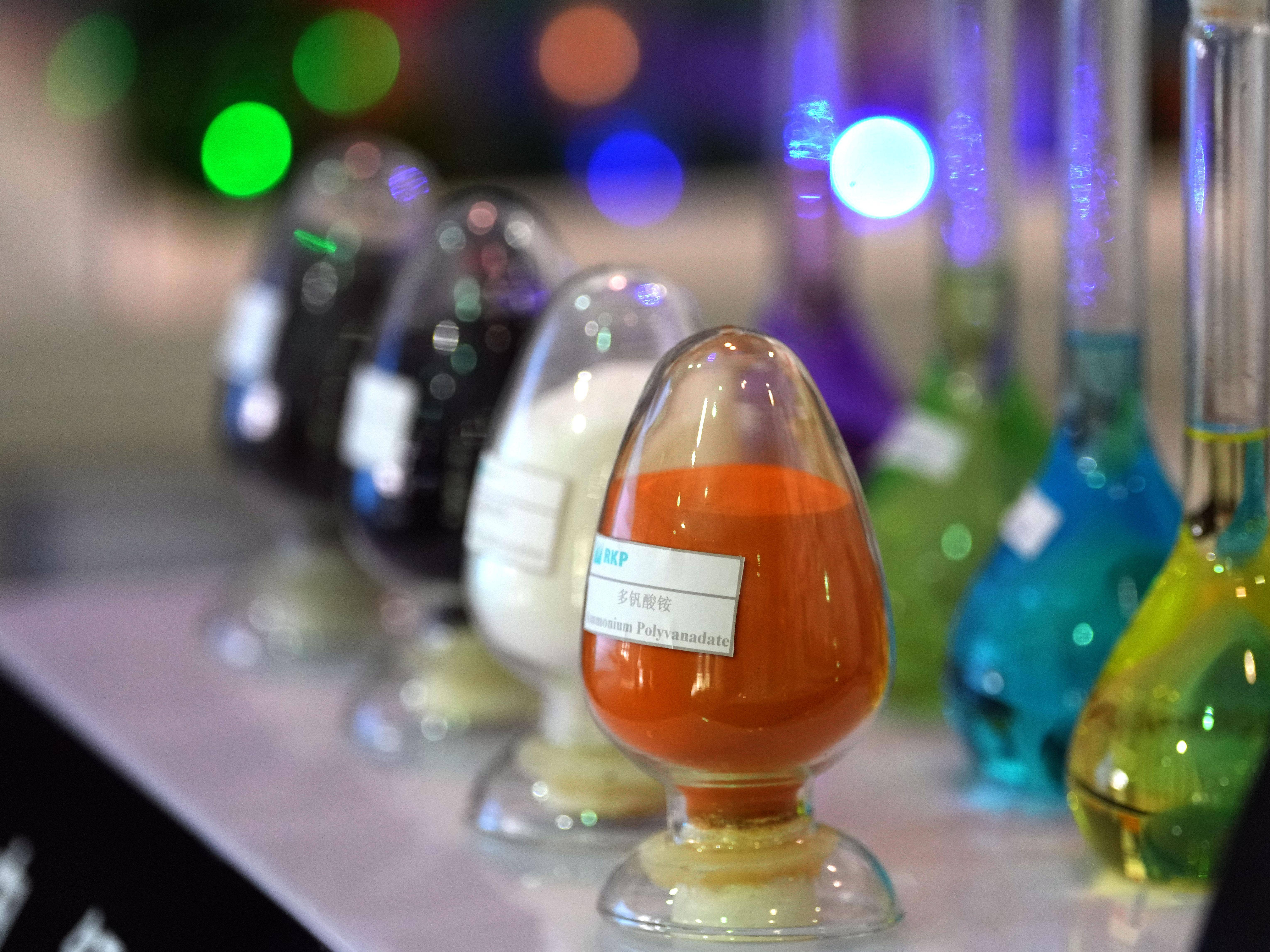 6月15日在大连融科储能技术发展有限公司拍摄的多钒酸铵等样品。大连融科储能技术发展有限公司致力于全钒液流电池储能技术创新和应用探索,拥有国际、国内技术专利300余项,产品广泛应用于电网调峰、可再生能源并网、工商业微网等领域。 新华社记者 章磊 摄