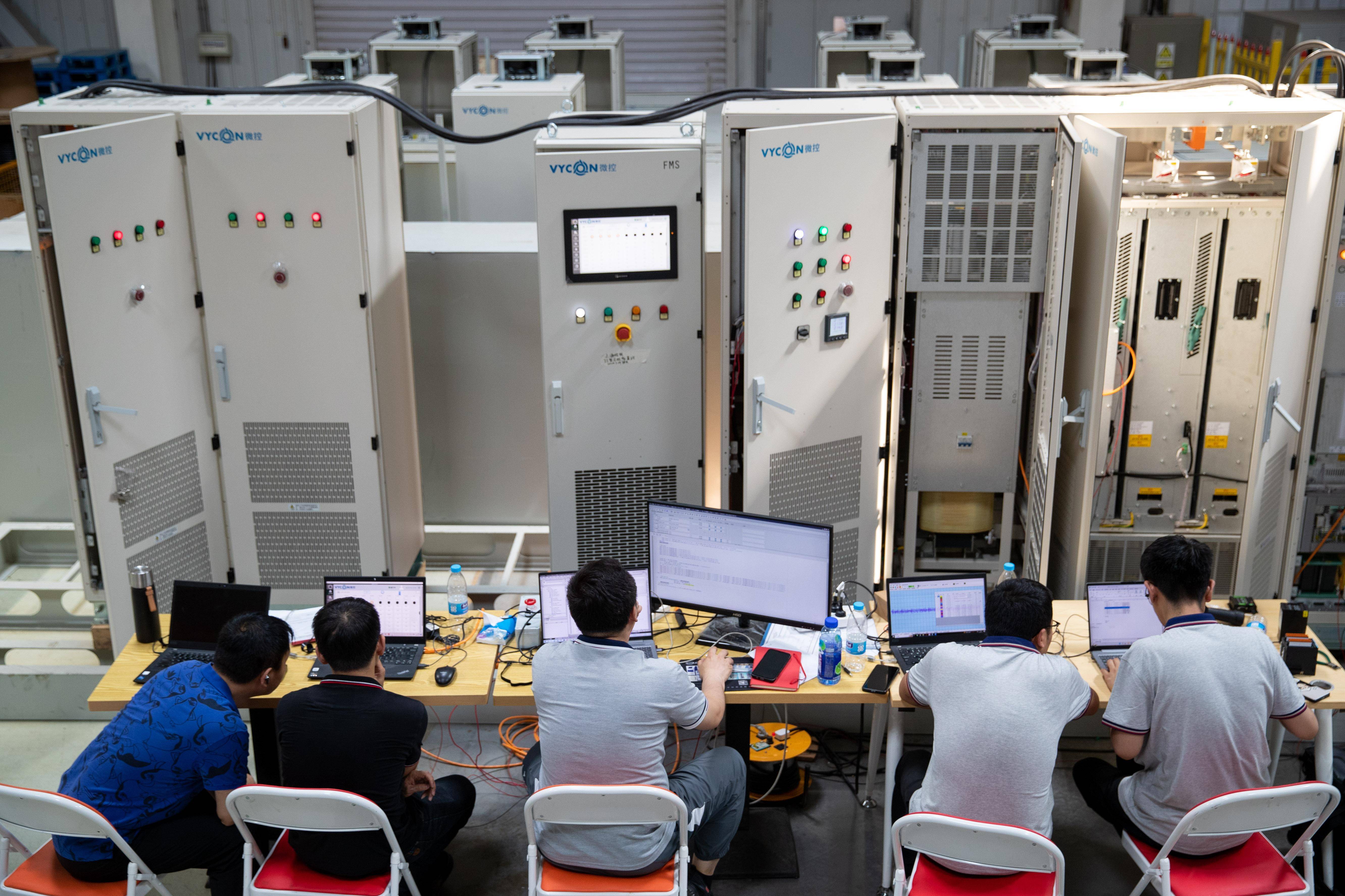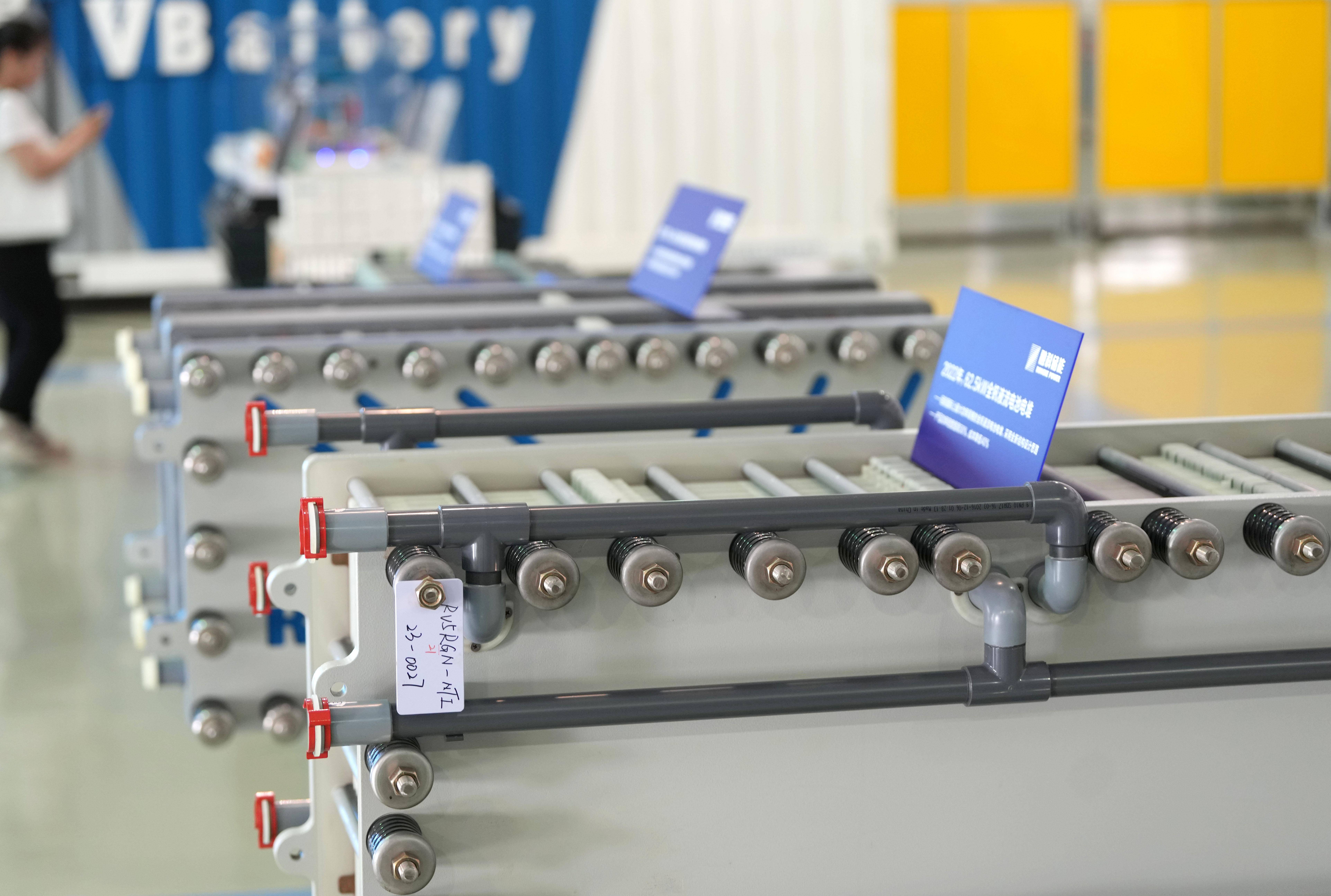 6月15日在大连融科储能技术发展有限公司拍摄的全钒液流电池系统。大连融科储能技术发展有限公司致力于全钒液流电池储能技术创新和应用探索,拥有国际、国内技术专利300余项,产品广泛应用于电网调峰、可再生能源并网、工商业微网等领域。 新华社记者 杨青 摄
