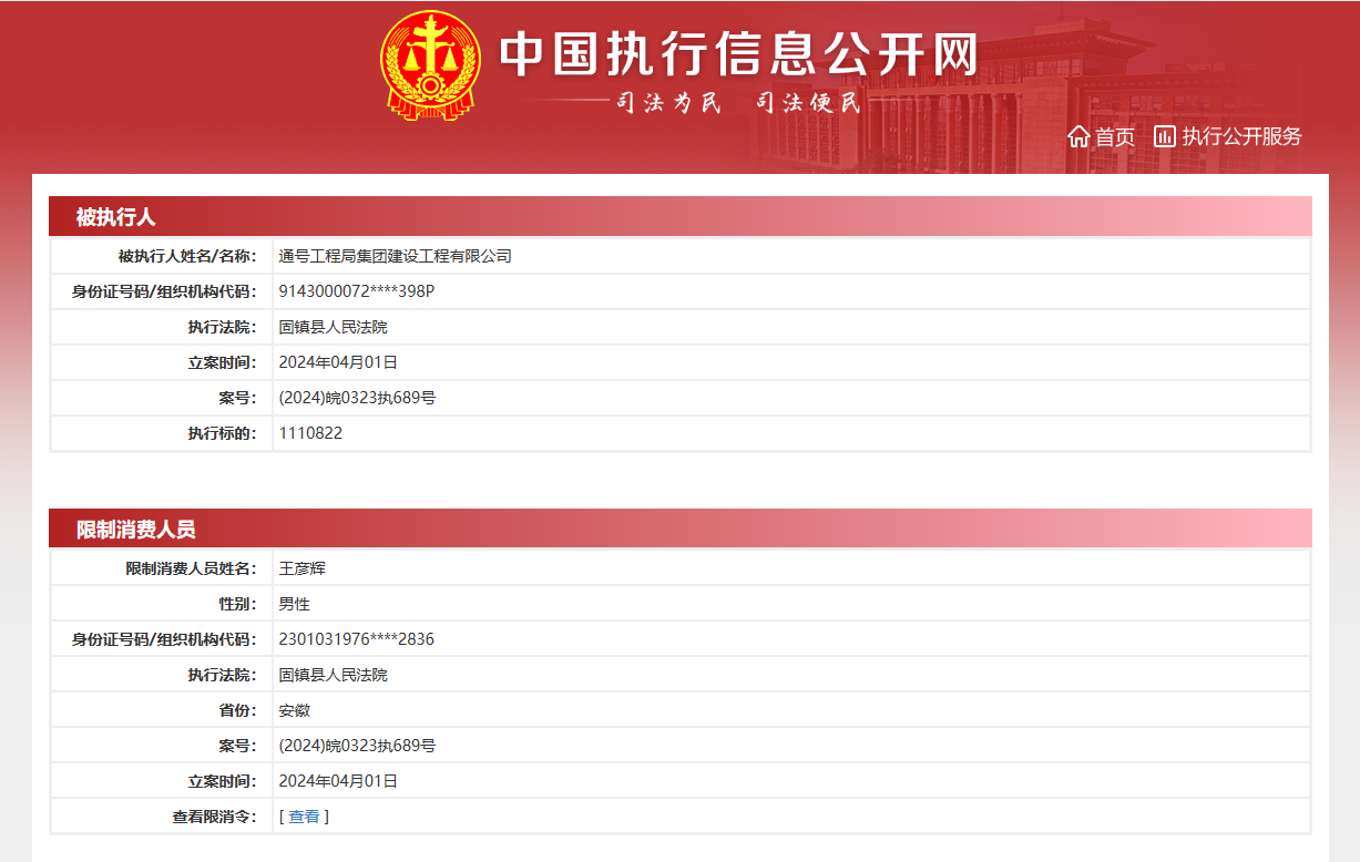 通号工程局集团建设工程有限公司被执行,法人代表王彦辉被限高