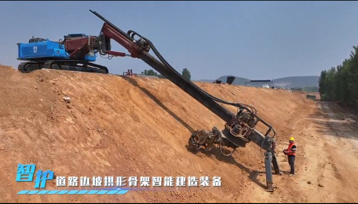 这是一台原创装备,类似挖掘机的机身,停在还未摊铺面层的路基上,履带轮正垫着防滑铁片。“车身”侧面长约12米的“手臂”在已经整形完成的边坡上进行滑模摊铺作业。它先来回在边坡上“描”出了拱形的基槽,又不急不慢地将现场混凝土搅拌车送来的混凝土“摁”进了基槽,陆续“画”出了标准的拱形骨架。这个看起来笨拙的“手臂”背后,是多项智能建造技术的突破。