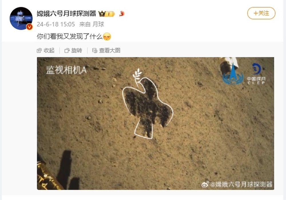 原来这只“和平鸽”就是6月4日嫦娥六号在月球背面采样后月背呈现的那个“中”字。