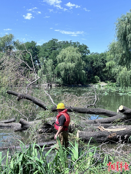 清理那些倒在湖里的树,难度更大。文兰说,圆明园福海边是树木倒伏的“重灾区”,不少柳树往湖里倒,泡在水里后树干会变得更重,工人要穿防护衣下水作业。6月12日上午11点,中青报·中青网记者观察到,涵秋馆附近水域有一大截树干,已被套上绳子等待上岸。