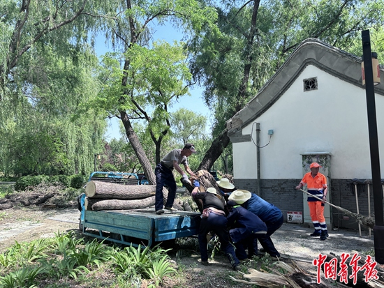 6月12日,圆明园内,工人正在清运倒伏的树木。