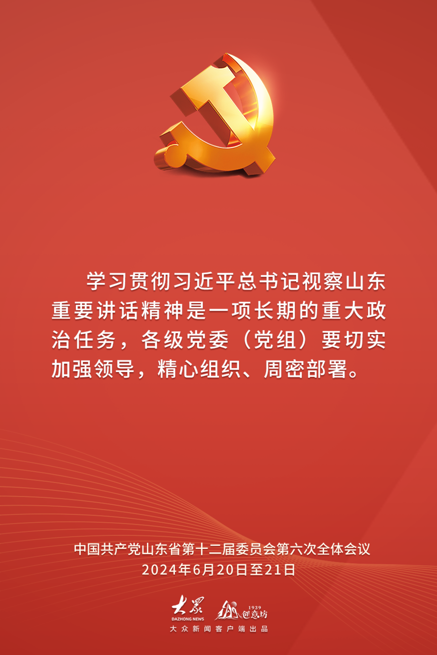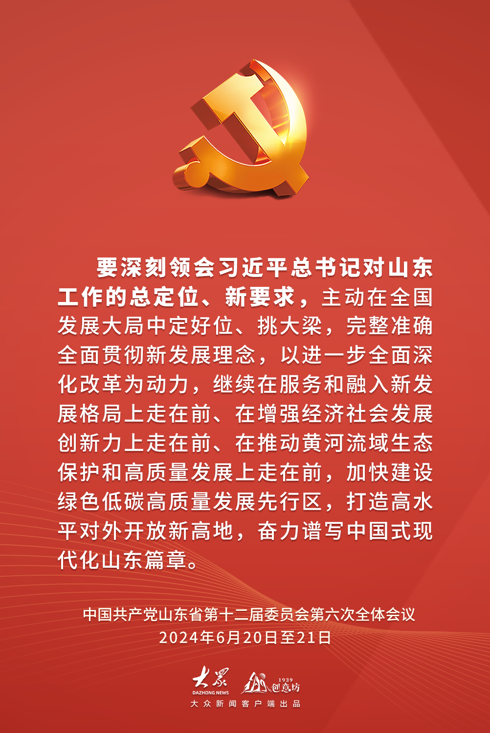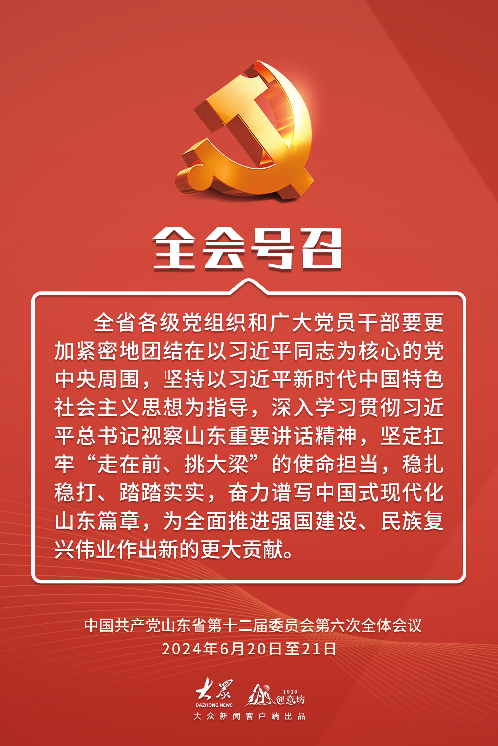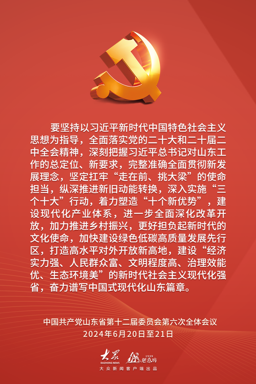 2024年6月20日至21日,中国共产党山东省第十二届委员会第六次全体会议在济南举行。全会以习近平新时代中国特色社会主义思想为指导,深入学习贯彻习近平总书记视察山东重要讲话精神,审议通过了《中共山东省委关于深入学习贯彻习近平总书记视察山东重要讲话精神奋力谱写中国式现代化山东篇章的决定》,审议了《关于全省党纪学习教育工作情况的报告》。全会有哪些内容?作出哪些具体部署?一起速览。