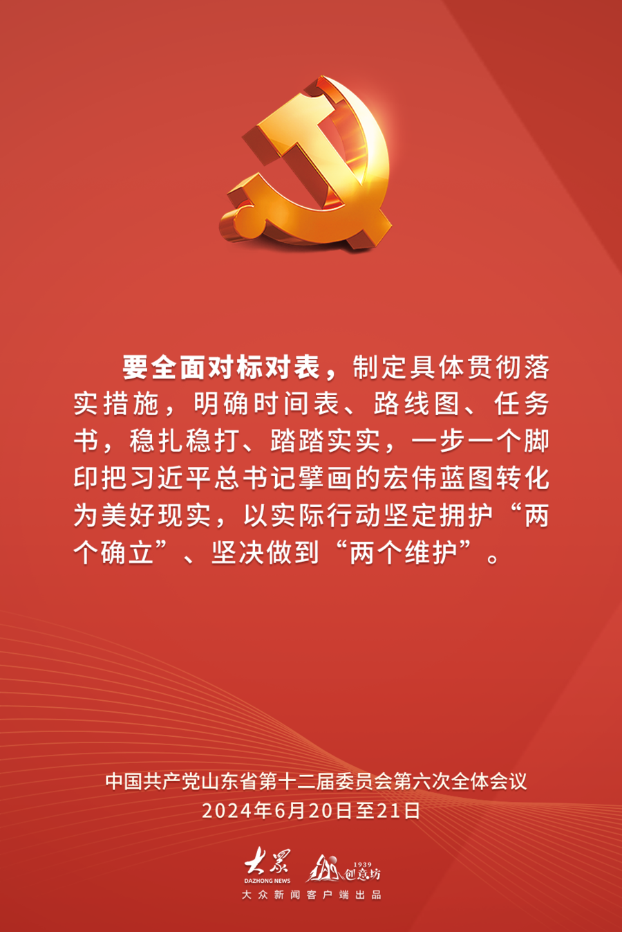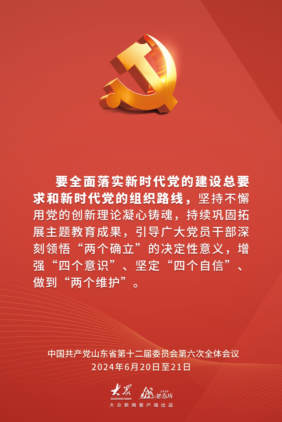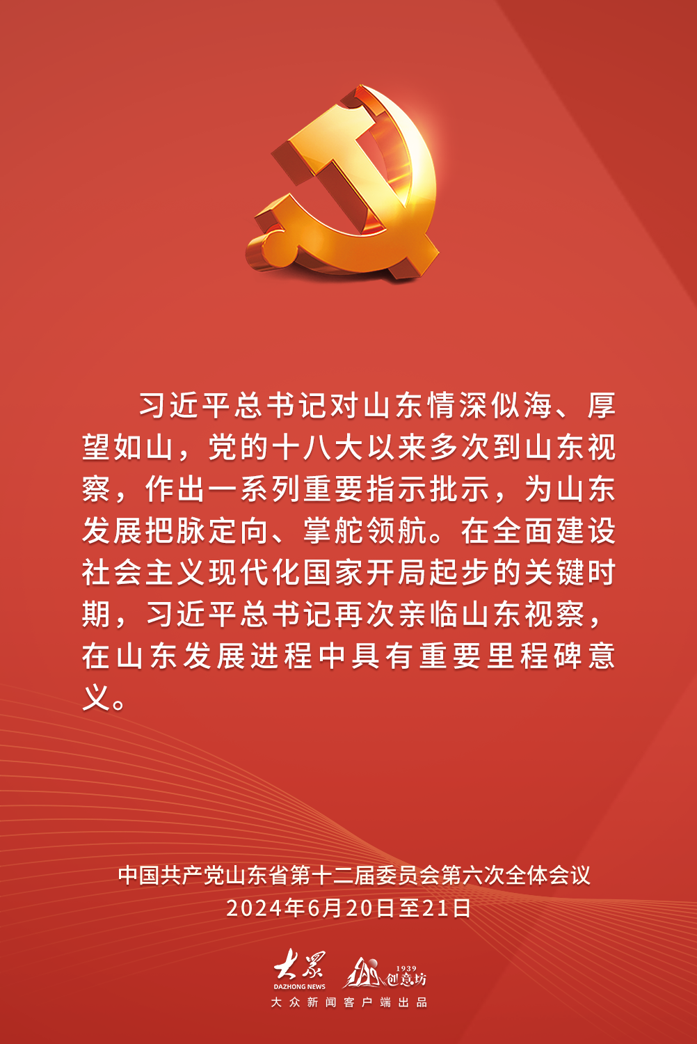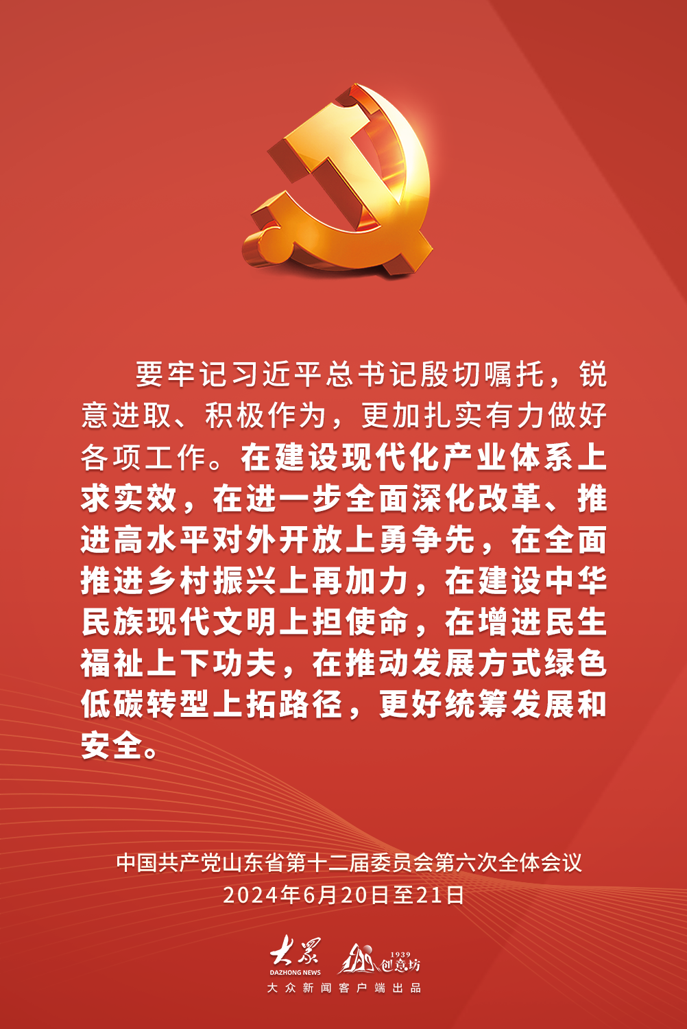 2024年6月20日至21日,中国共产党山东省第十二届委员会第六次全体会议在济南举行。全会以习近平新时代中国特色社会主义思想为指导,深入学习贯彻习近平总书记视察山东重要讲话精神,审议通过了《中共山东省委关于深入学习贯彻习近平总书记视察山东重要讲话精神奋力谱写中国式现代化山东篇章的决定》,审议了《关于全省党纪学习教育工作情况的报告》。全会有哪些内容?作出哪些具体部署?一起速览。