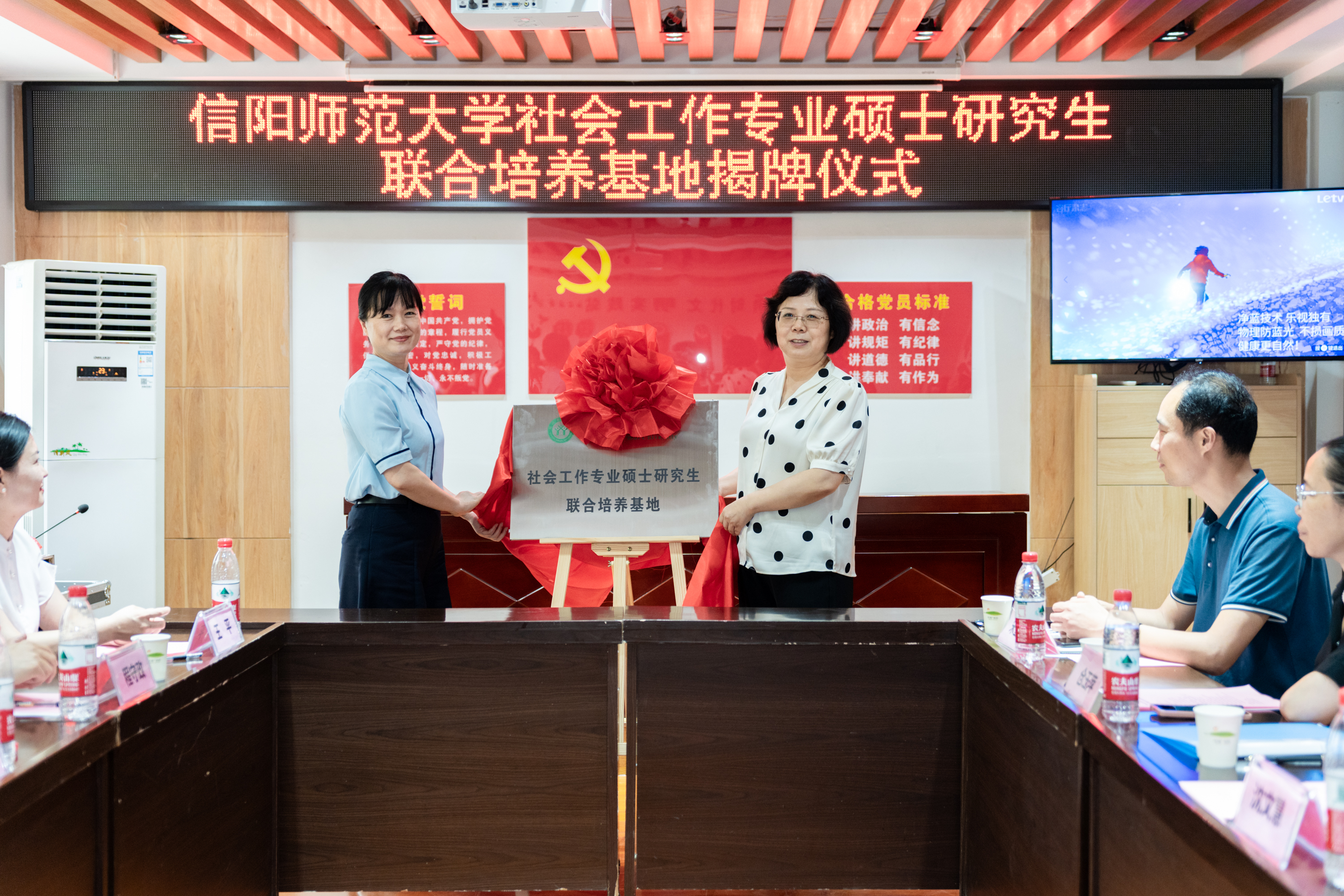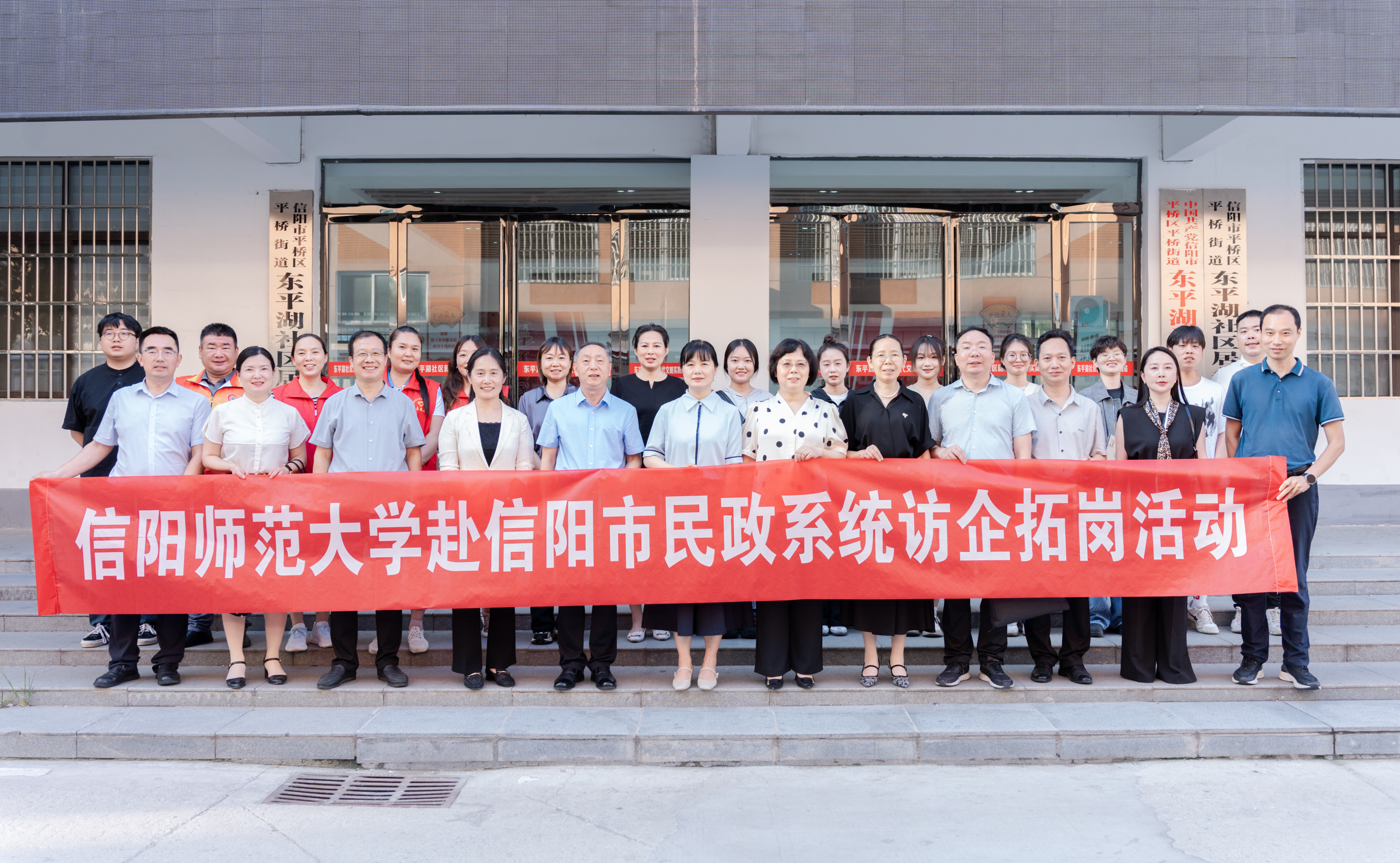 6月20日,信阳师范大学社会工作专业硕士研究生联合培养基地揭牌仪式暨赴信阳市民政系统访企拓岗活动在平桥区东平湖社区服务中心举行。中共信阳市委社会工作部副部长王艳阳,信阳市民政局党组副书记、副局长程守政,信阳市民政局四级调研员杨威,中共信阳市平桥区委社会工作部副部长王平,平桥区民政局副局长周慧,信阳祥和社会工作服务中心理事长周俊峰,信阳师范大学研究生处处长沈文慧,校研究生工作部副部长、研究生处副处长仓玉萍,法学与社会学学院副院长古瑞华、张玉鹏,党委委员、社会工作系主任祁中山,师生代表及相关公益组织社会工作者、志愿者30余人参加活动。