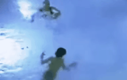 但实际上,一个穿着淡蓝色泳衣的孩子,正在泳池底部游泳。