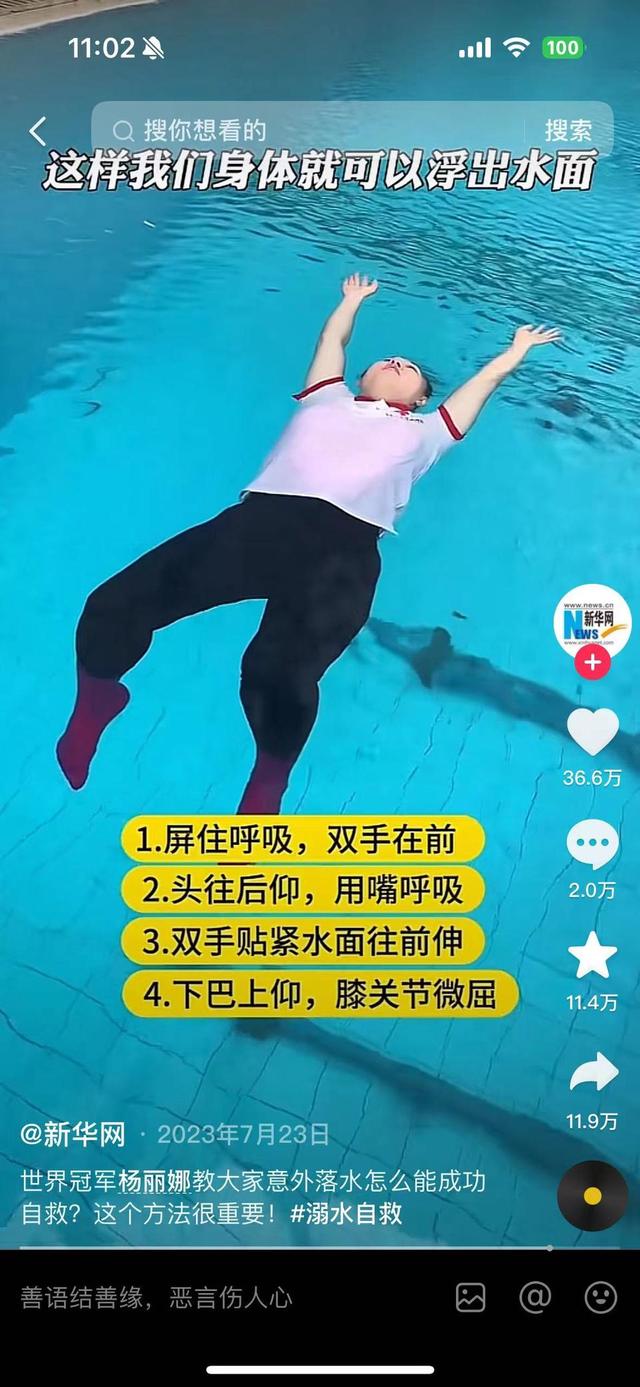 前中国游泳队运动员杨丽娜曾发视频表示,如果不慎落水,一定不要惊慌,不要随便乱抓,保持冷静。第一时间先把手放在胸口两边,头向后仰,肚子挺起来腿弯曲。手顺着两边伸到头顶的上方,保持平衡的状态。杨丽娜提醒,记住手一定不要伸出水面,只要手出水面,头就会沉下去。