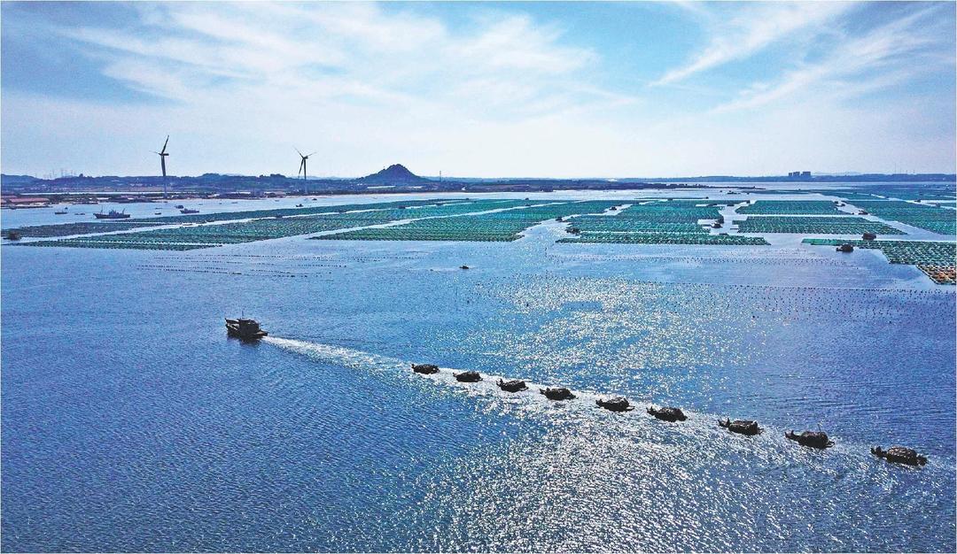 6月4日,在荣成市一处海洋牧场,养殖工人驾驶养殖船进行海水养殖作业。(通讯员 王福东 报道)