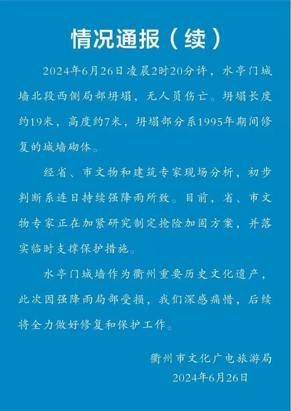 6月26日,衢州市文化广电旅游局发布后续情况通报称,2024年6月26日凌晨2时20分许,水亭门城墙北段西侧局部坍塌,无人员伤亡。坍塌长度约19米,高度约7米,坍塌部分系1995年期间修复的城墙砌体。