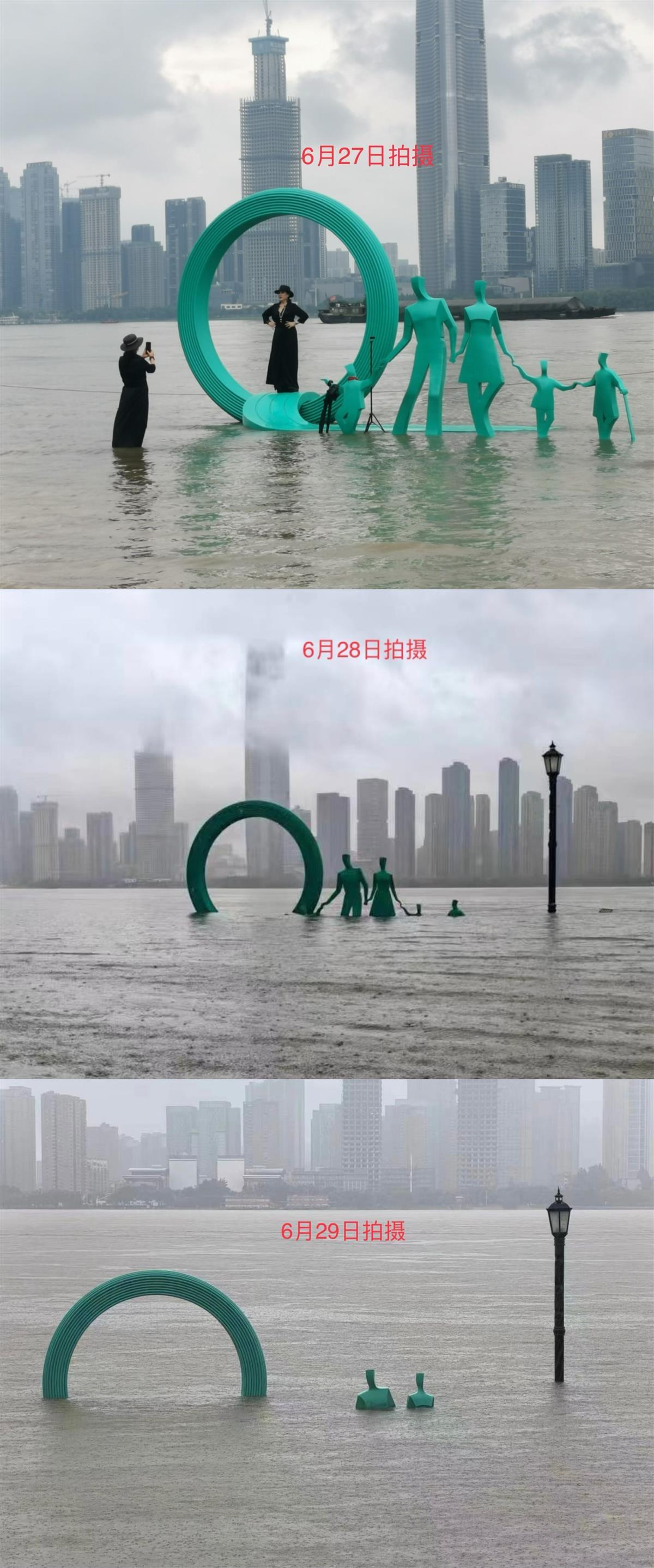 极目新闻记者连续多日在汉口江滩看到,水位接连上涨,逐渐淹没江滩一些标志性景观。以“一家五口”雕塑为例,27日仅仅淹没雕塑基座,还有市民与雕塑合影打卡。而到了29日,江水已淹没到雕塑中成年人的胸口。