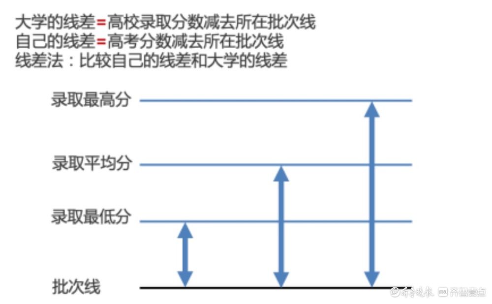我们首先来看线差法。什么叫线差?其实就是高校的录取分数减去所在批次线所得到的差。录取分数有录取的最高分、录取的平均分、录取的最低分, 所以线差也有三种,就是最高分线差、最低分线差和平均分线差。所谓线差法就是就是看这几条线之间的差距,最低分比批次线高多少、平均分高多少、最高分高多少。比较自己的线差(即自己的分数减去所在批次的分数所得的差值)和目标院校的线差(即上文提到的最高分线差、最低分线差和平均分线差),就可以知道自己与目标院校的匹配情况,填报是否稳妥。如下图: