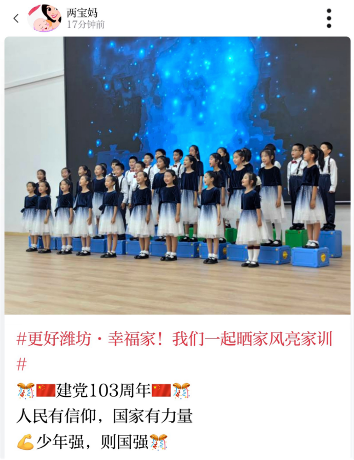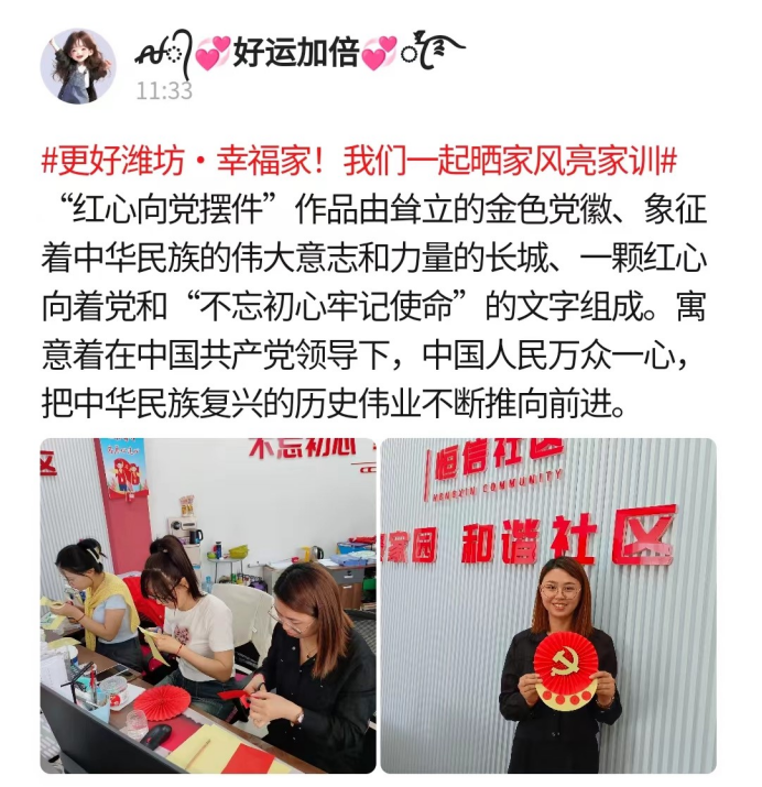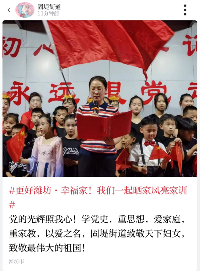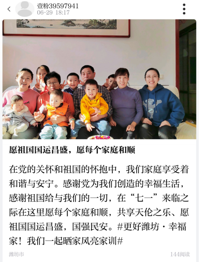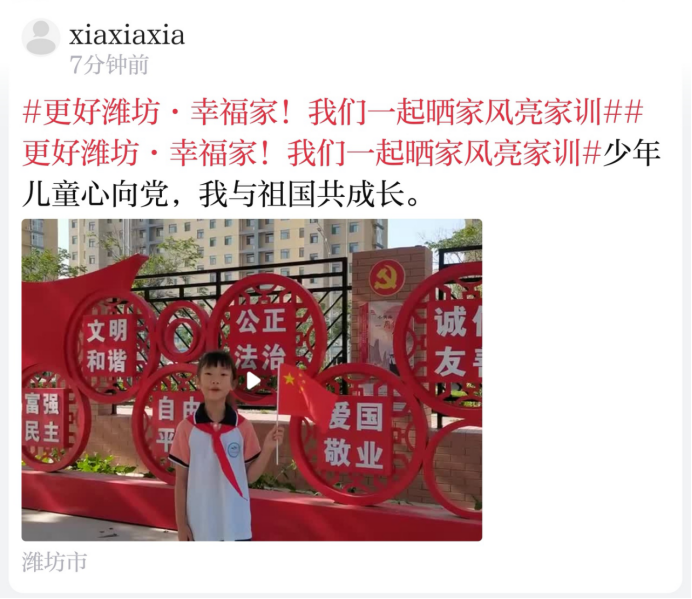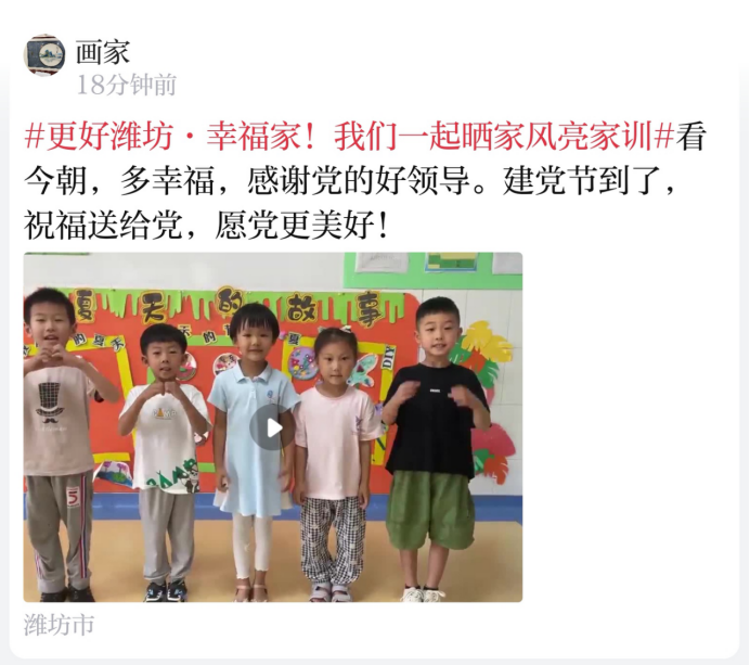 近日,潍坊市妇联推出互动话题#更好潍坊·幸福家!我们一起晒家风亮家训#,广大家庭在这里向党深情表白,用一句句质朴的话语编织出对党的祝福。一起来感受小家大爱吧!