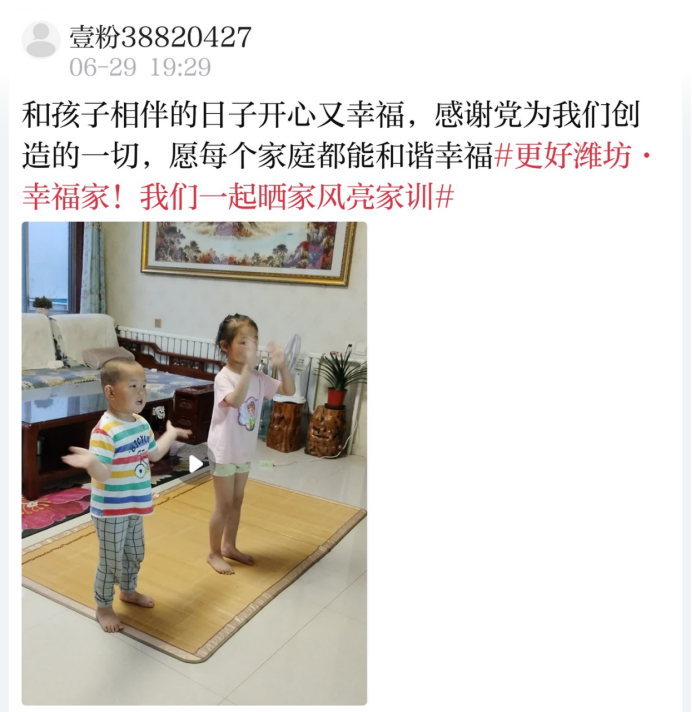 在温馨的家庭画卷中,每一抹色彩都是家国情怀的细腻勾勒。在美好的家庭生活中,每一个故事都是更好潍坊的最好注脚。#更好潍坊·幸福家!我们一起晒家风亮家训#互动话题为潍坊市广大家庭提供了一个传递正能量,汇聚家力量的网络空间,用“大流量”澎湃“家力量”。