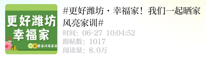 截至目前, #更好潍坊·幸福家!我们一起晒家风亮家训# 互动话题阅读量达8万,参与人次过千。