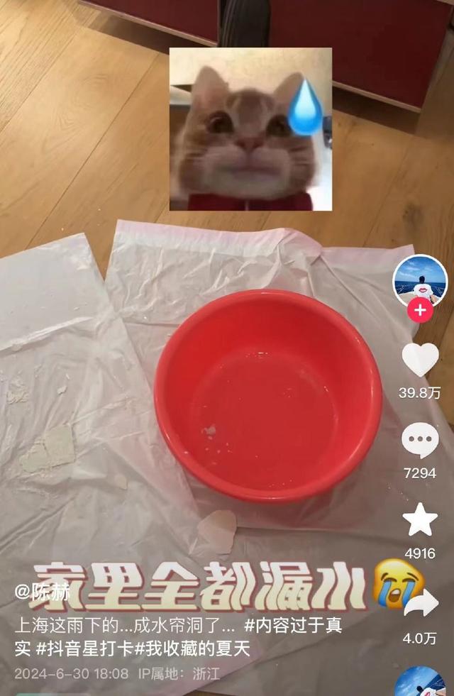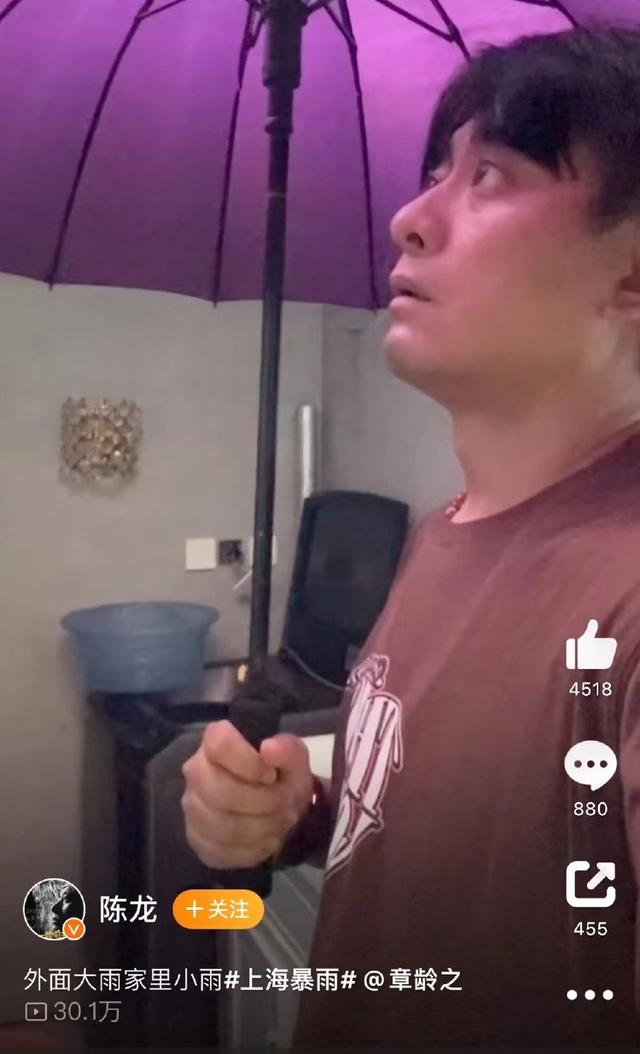 同样身处上海的演员陈龙也分享了自己的“悲惨”经历,自嘲家里的雨并不比外面小。视频中,他在家里也要打伞,家里接水的盆子“排排坐”。